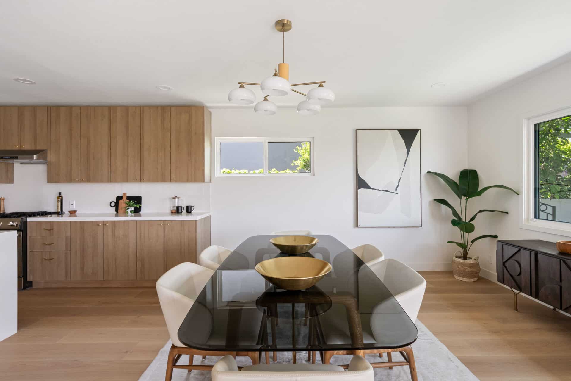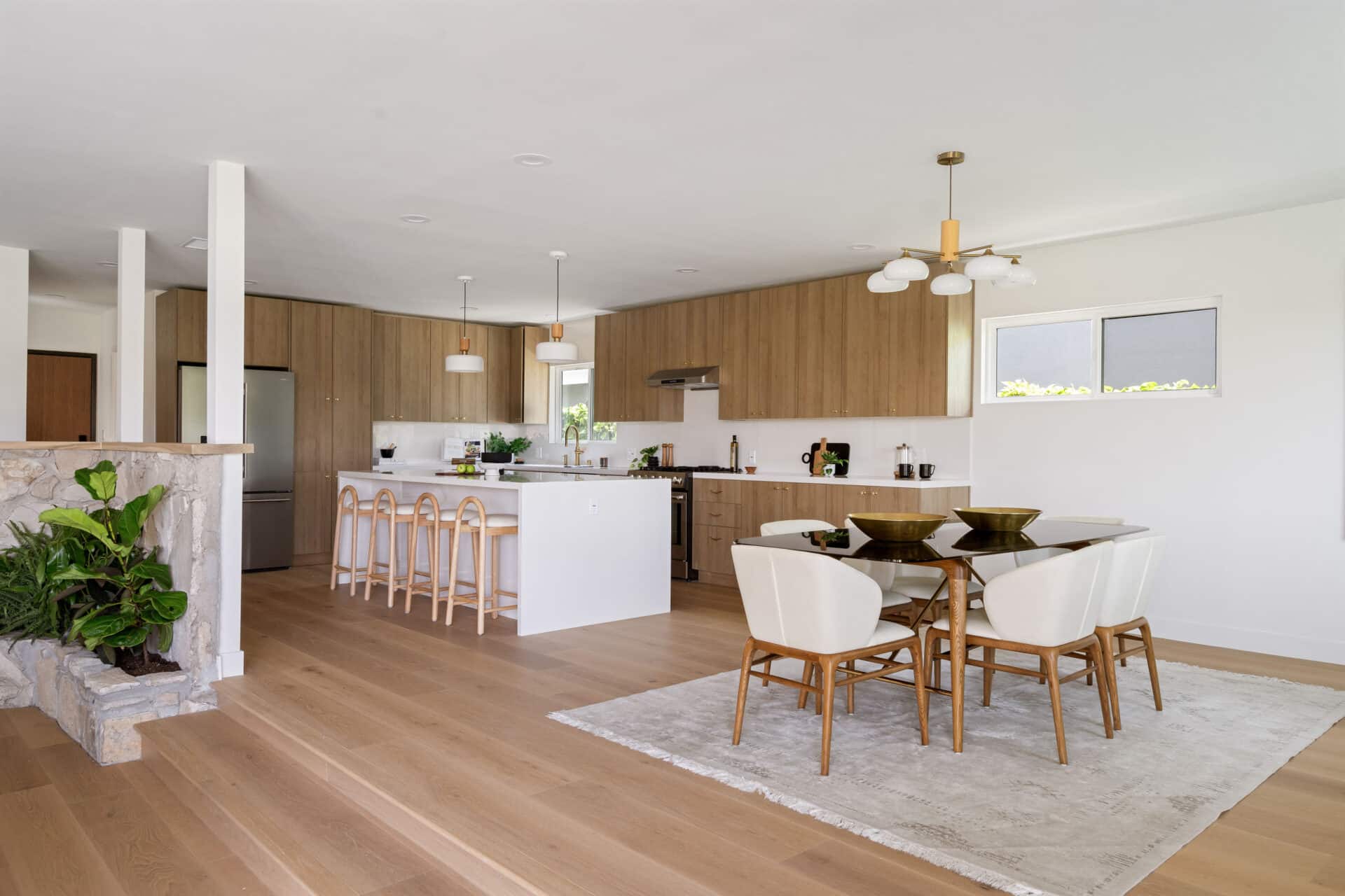 Step inside to a dramatic open-concept layout that connects the kitchen, dining, and sunken living room. Anchored by a sleek custom mantle and an original flagstone planter that nods to the home’s Mid-Century roots, the living room opens through expansive folding doors, inviting natural light and breezes from the West.