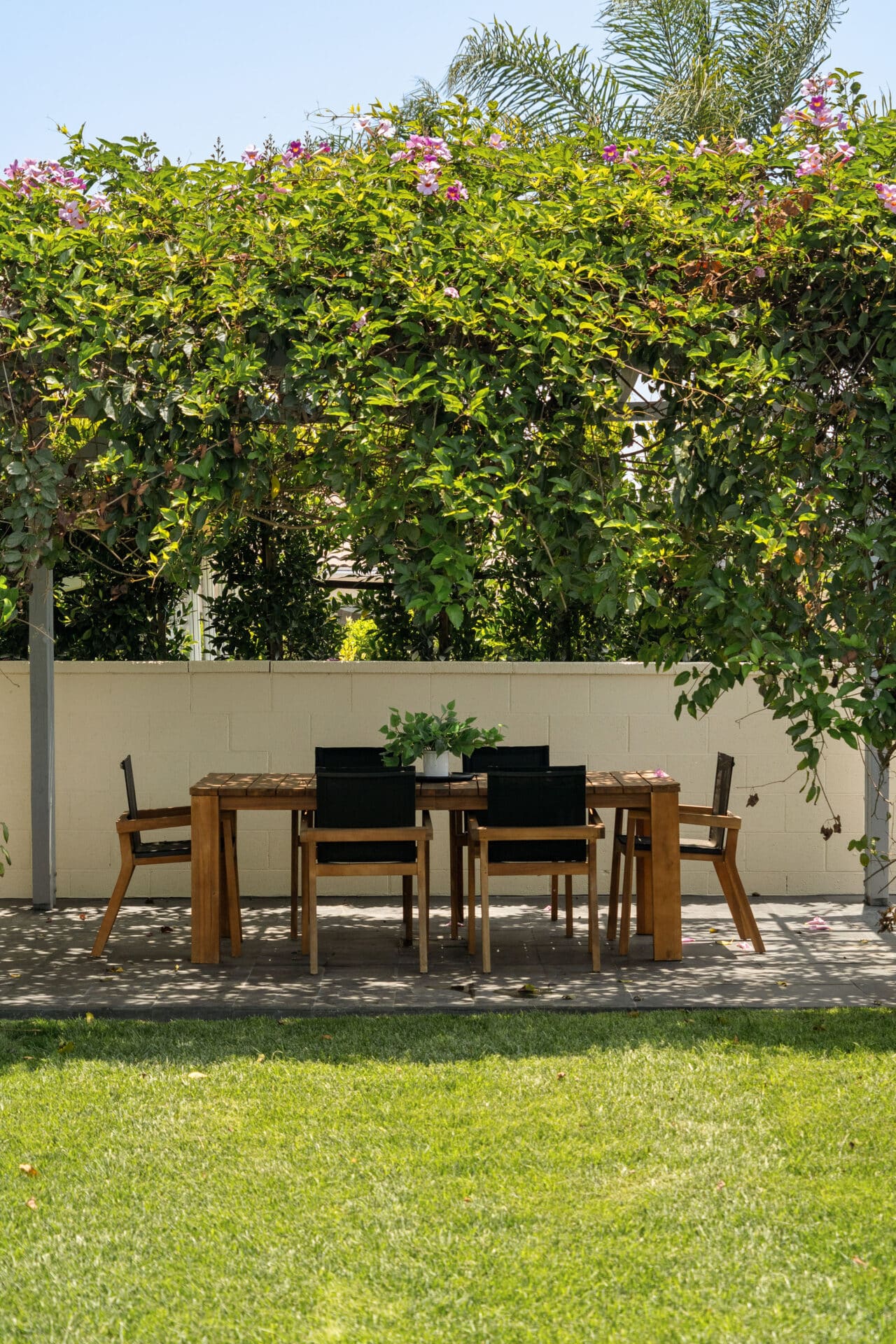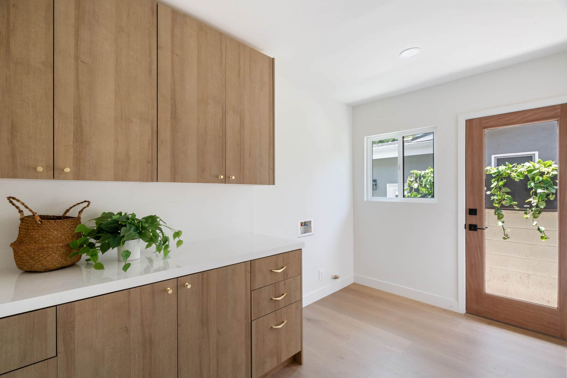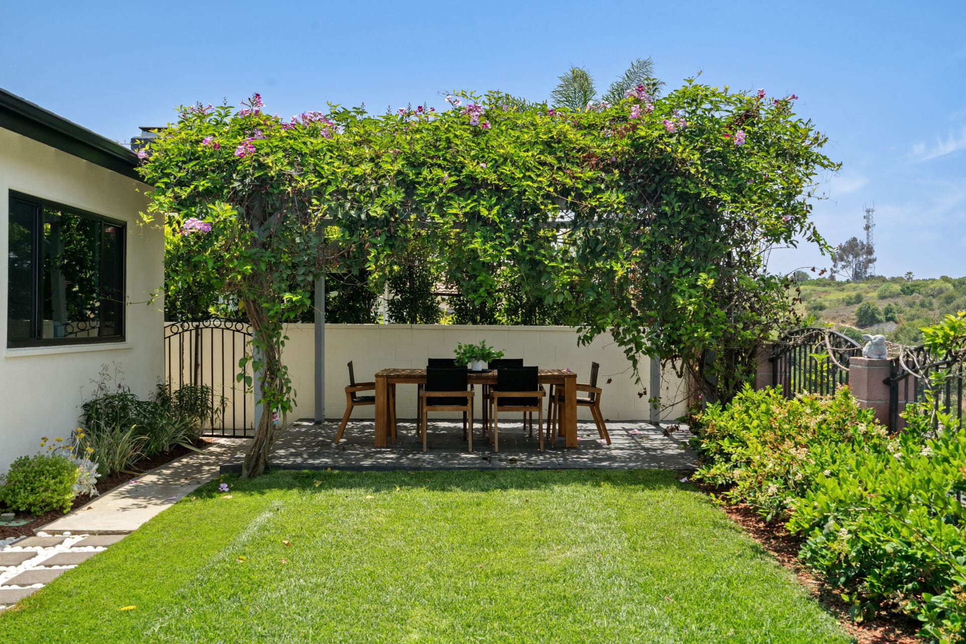 The gourmet kitchen is a showstopper—featuring elegant countertops with a full-height backsplash, a generous waterfall island perfect for gathering, and bespoke cabinetry accented with Rejuvenation hardware. Just beyond, the freshly landscaped backyard unfolds with a dreamy dining area beneath a pergola—ideal for al fresco meals and entertaining.