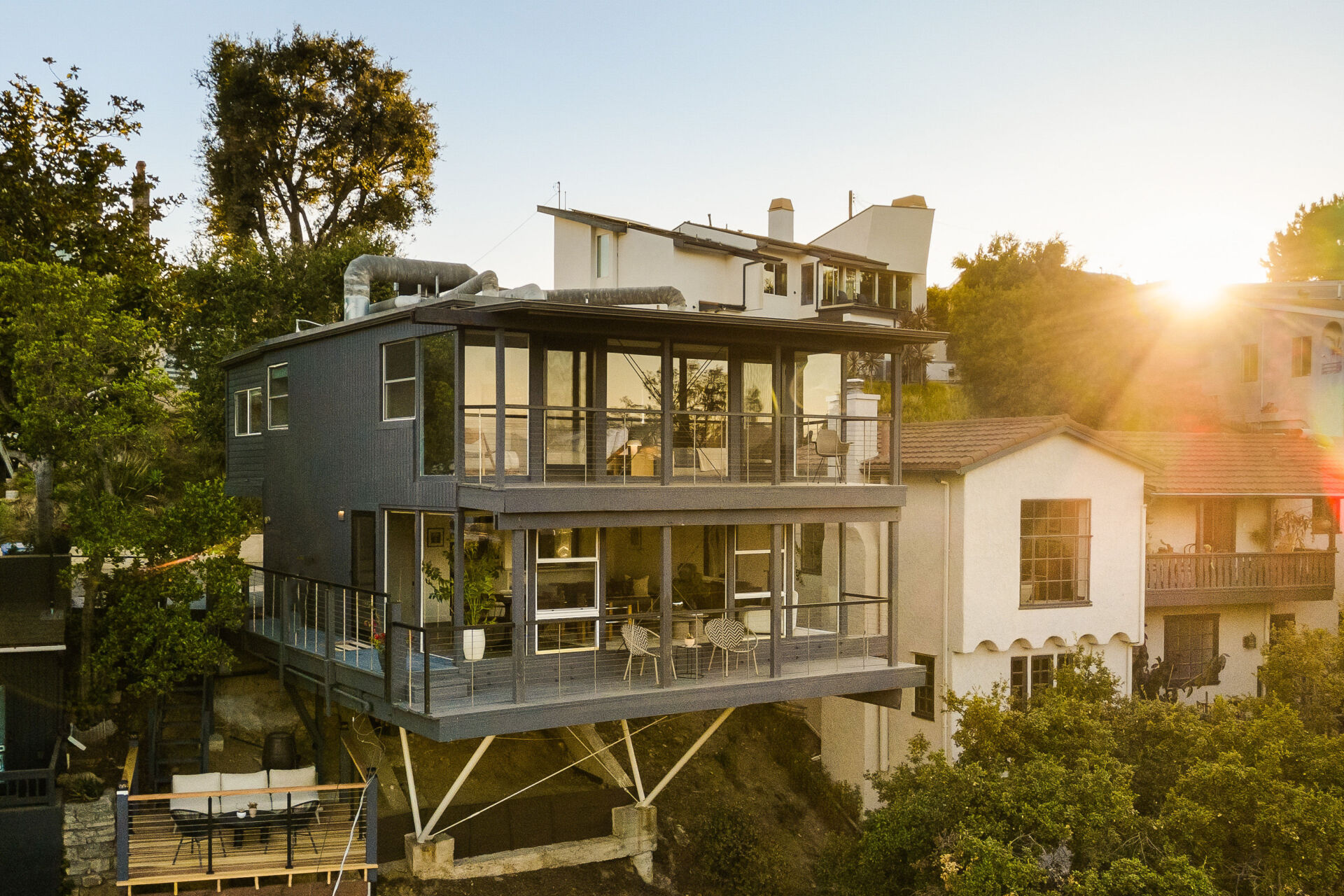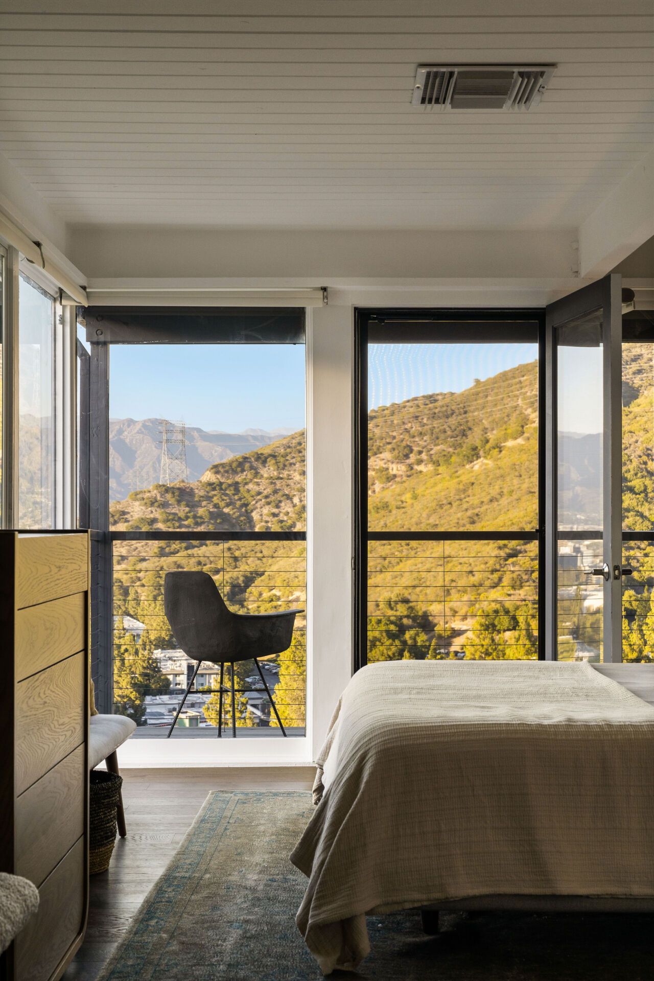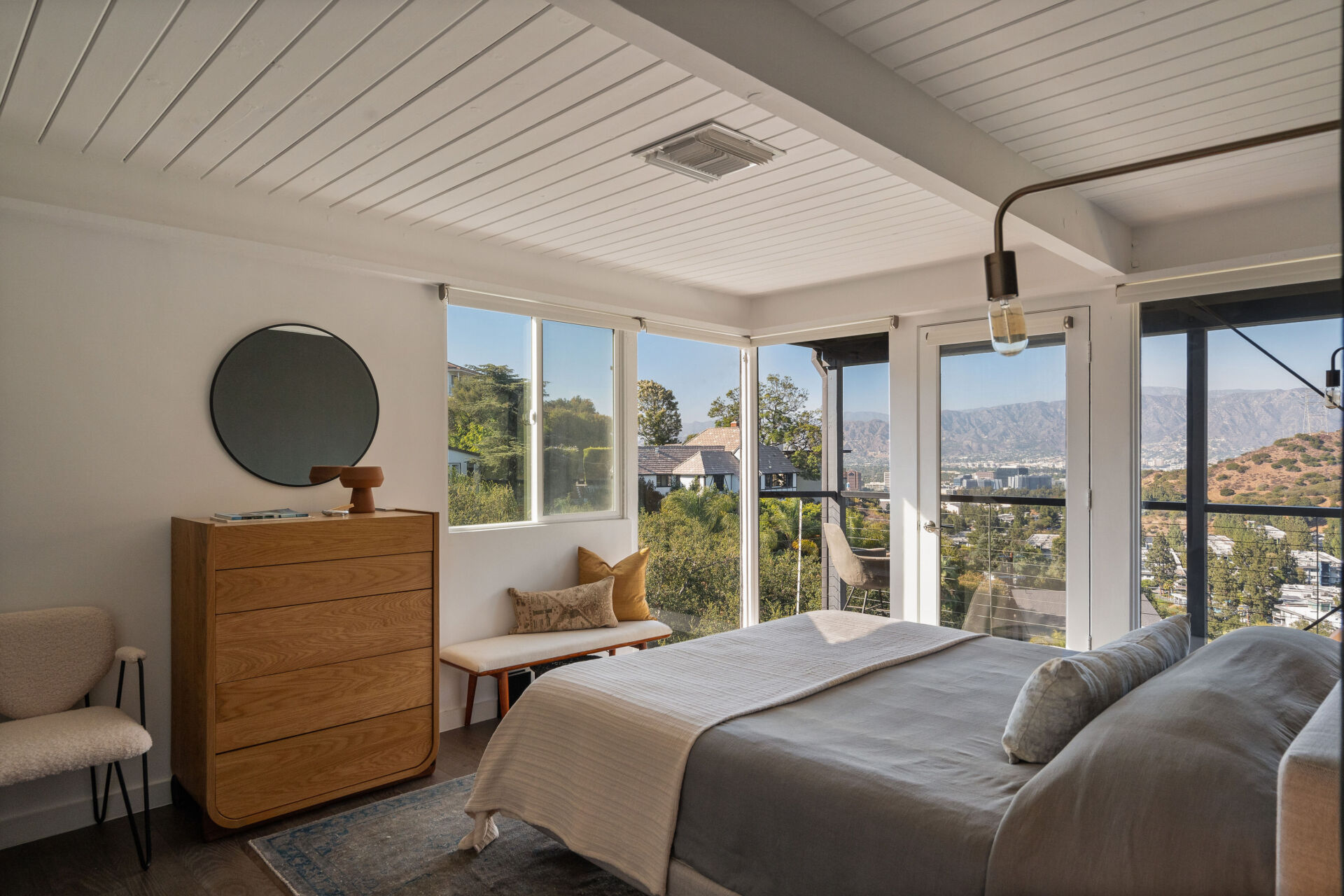 Perched high above Lake Hollywood on a peaceful street, the home embodies the soul of classic California modernism—clean lines, floor-to-ceiling glass, and a seamless indoor-outdoor connection that invites light, air, and stunning views into every corner. It captures sweeping panoramas that stretch from the hillsides to the city skyline—and sunsets that will leave you breathless.