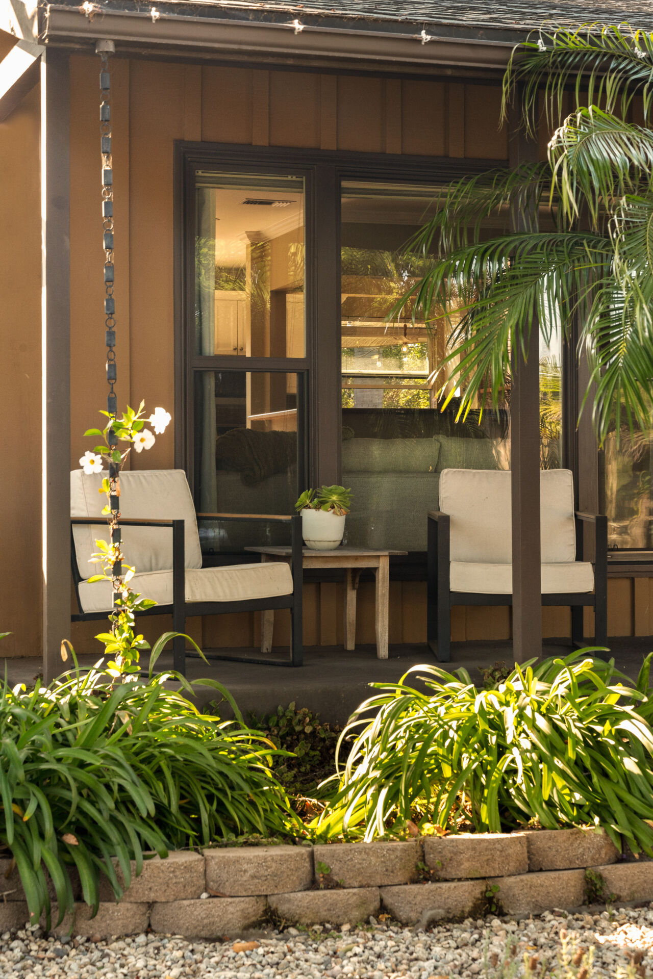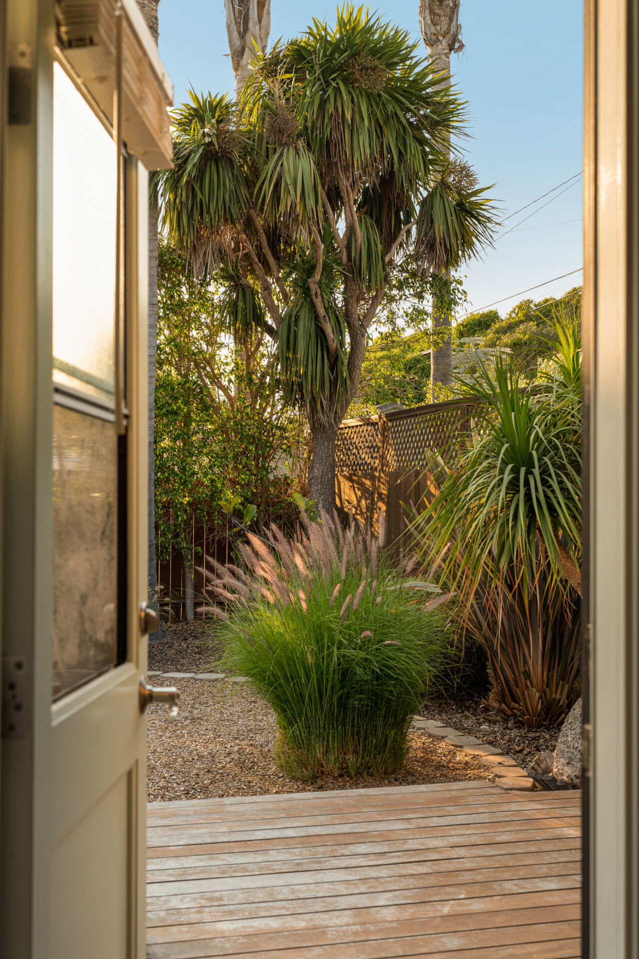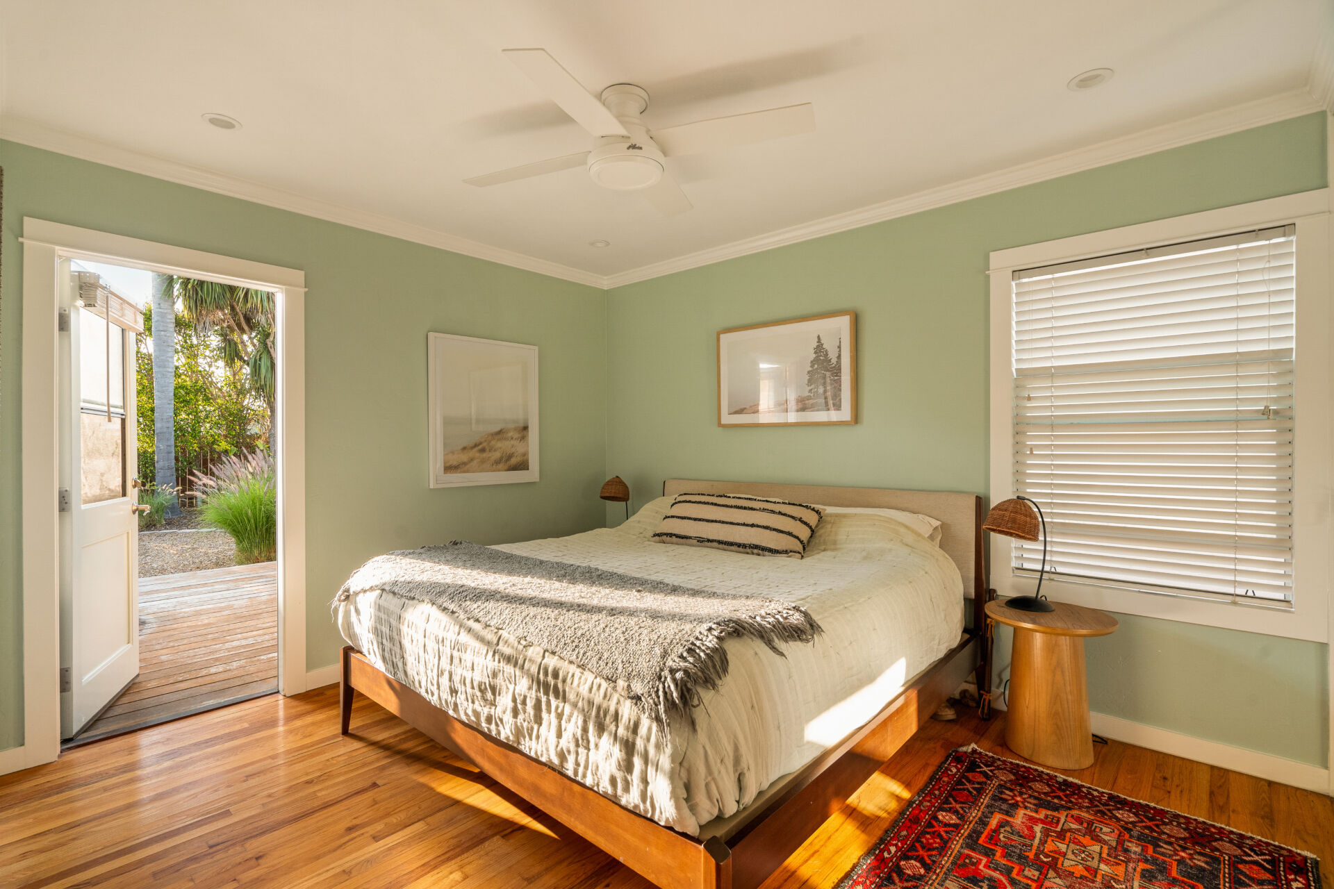 The open kitchen–living room floor plan is ideal for entertaining and flows seamlessly to both the charming front sitting porch and the fully fenced, private backyard. Host a dinner on the back patio under string lights beside the outdoor fireplace, or start your day on the back deck with direct access from the primary bedroom. Thoughtful low-water landscaping provides privacy, while large front windows allow for excellent natural light. Another benefit of this quiet corner lot property, is the 2 off-street parking spaces.