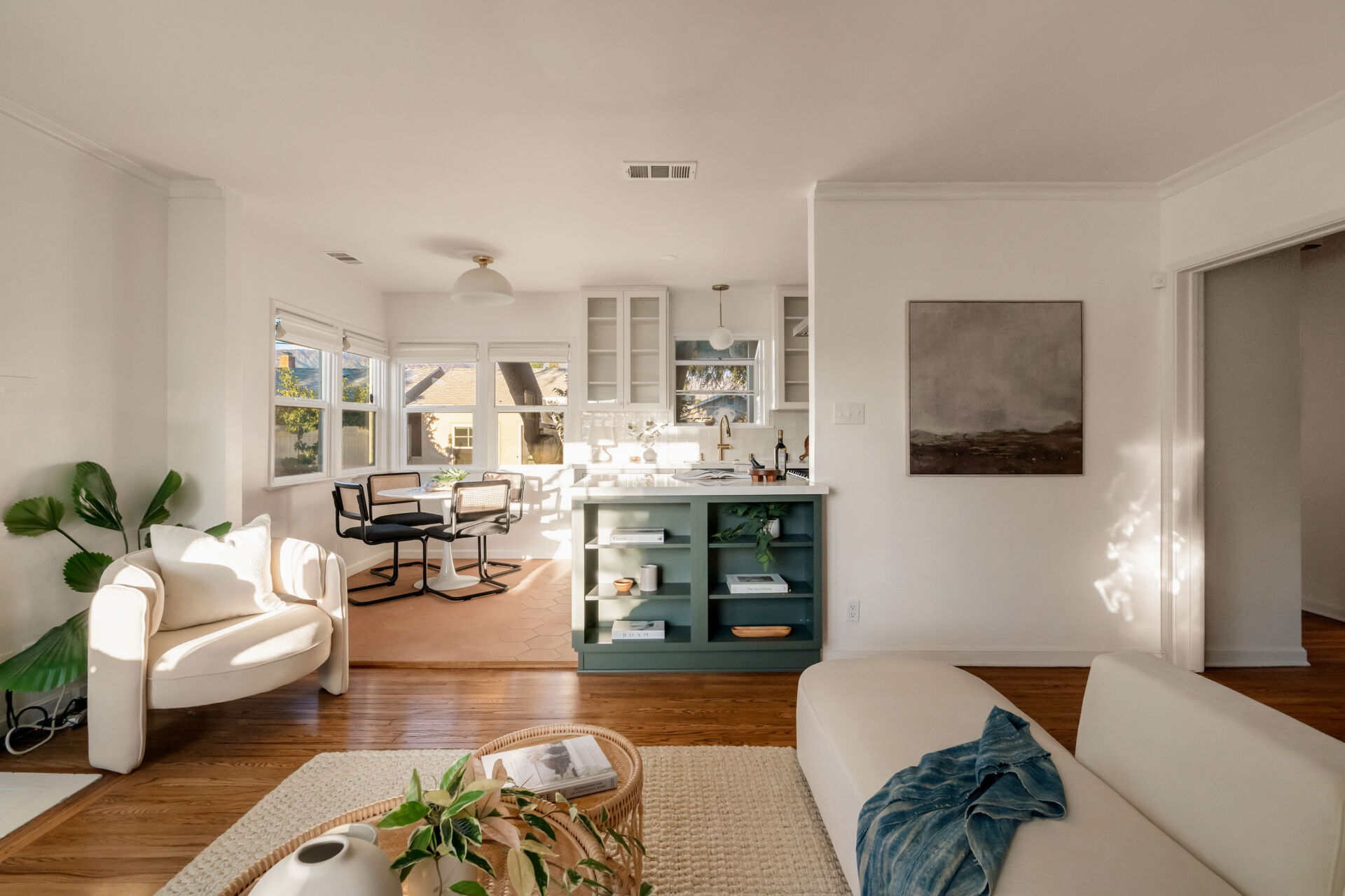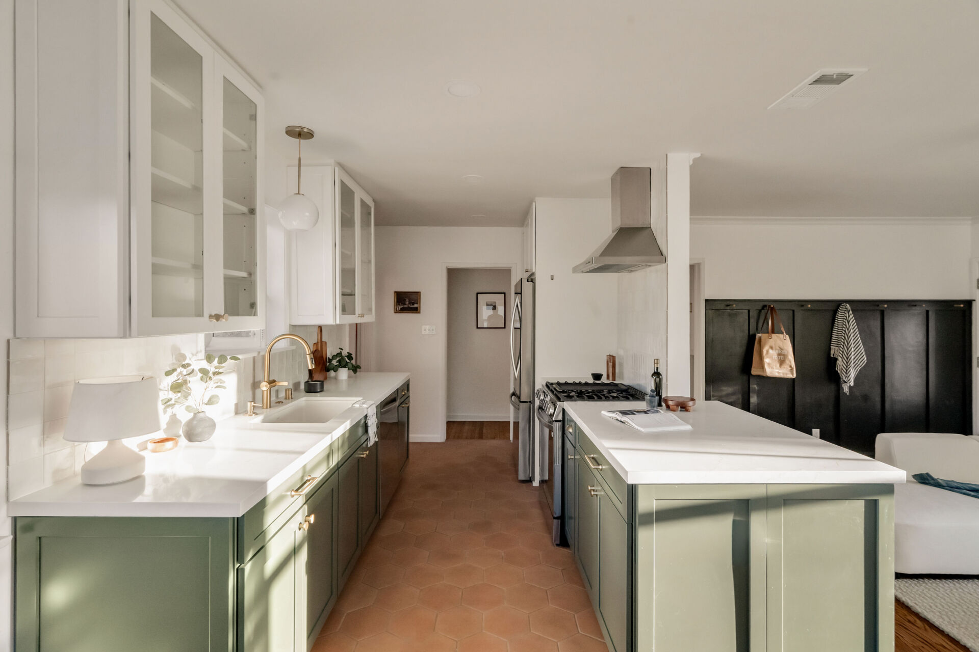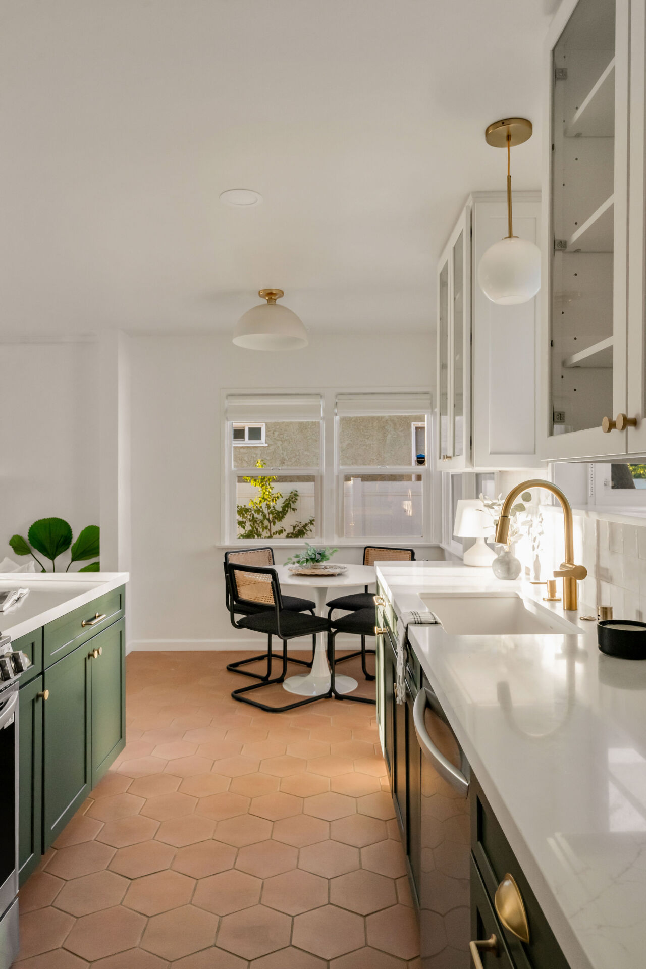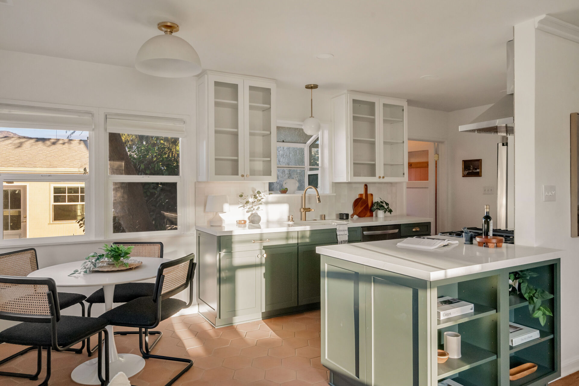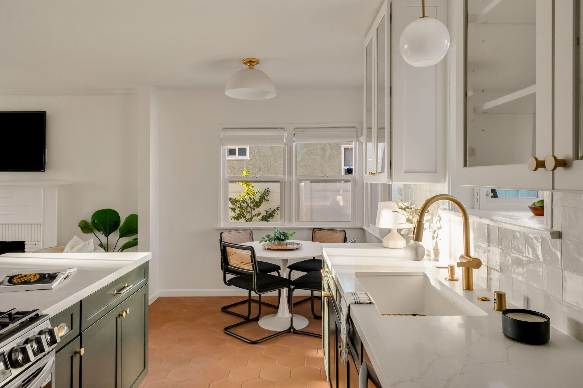 The kitchen, boasting handsome color accents, quartz counters, Cletile zellige backsplash, under-cabinet lighting, new stainless appliances including range with airfryer, custom cabinets, new brushed brass hardware, and Moen faucets, opens to a charming dining nook with new saltillo tile floors and designer chandelier.