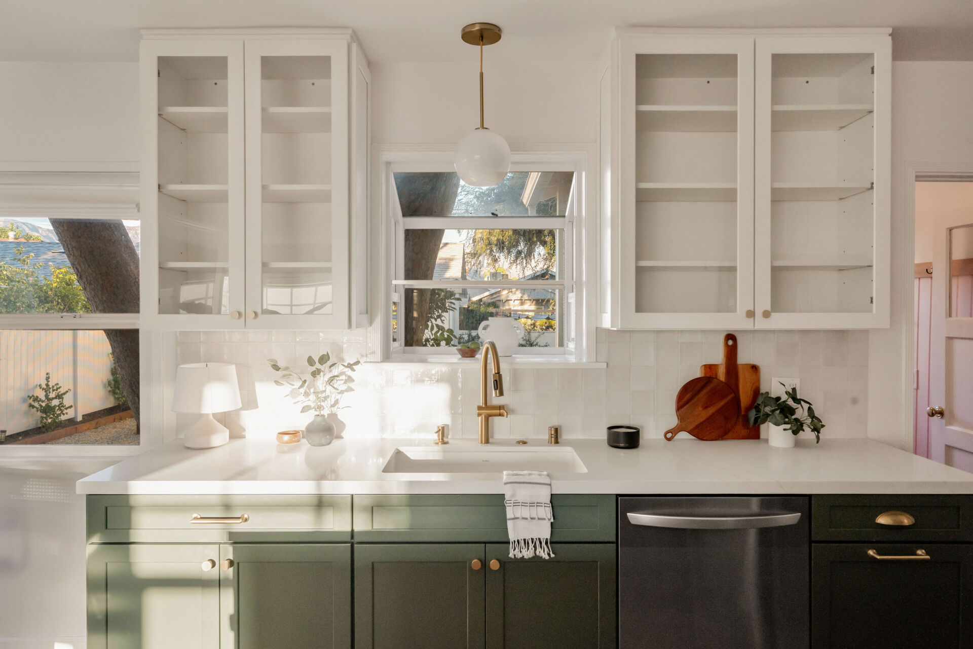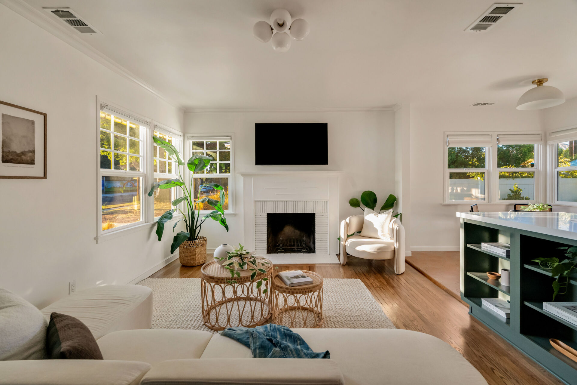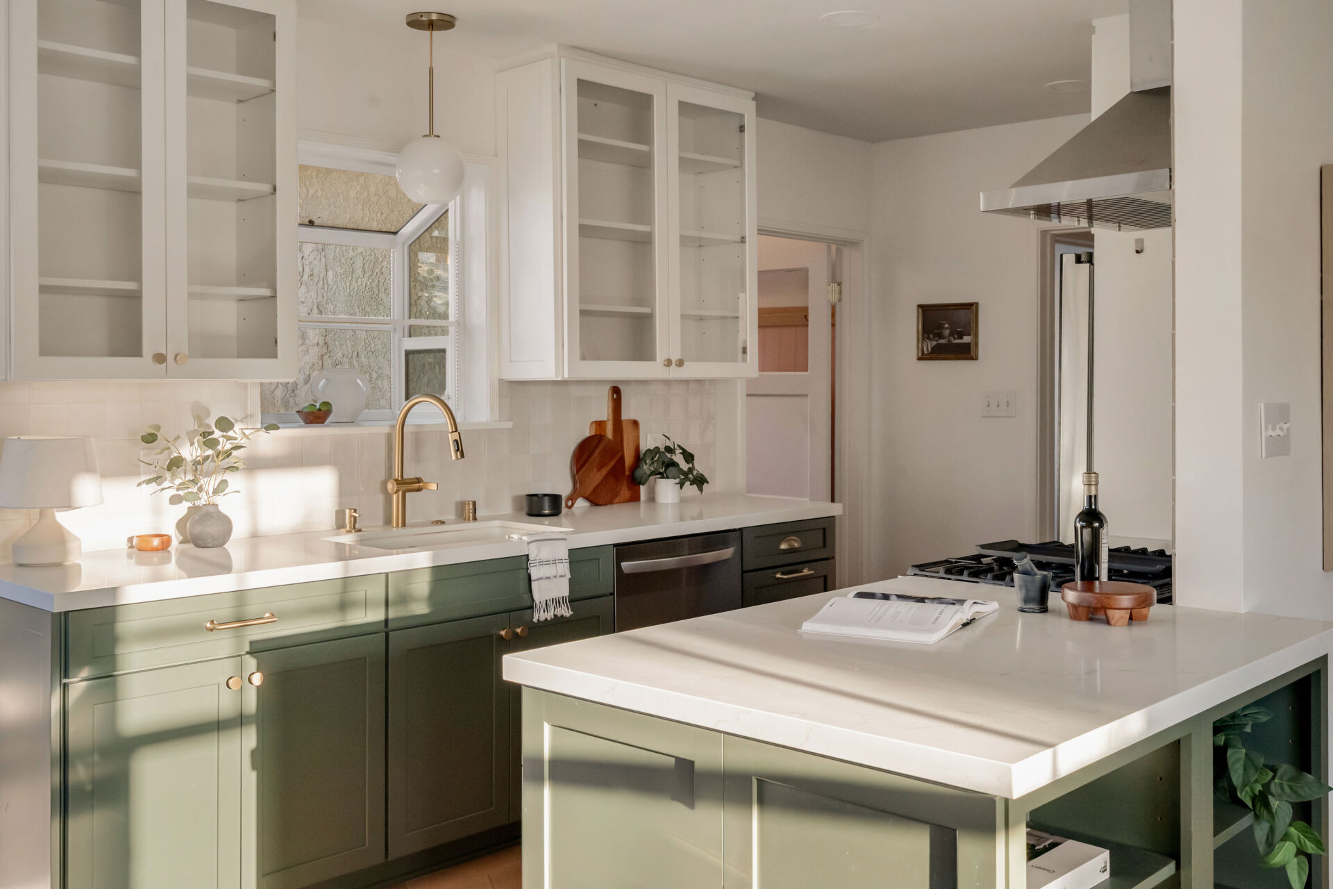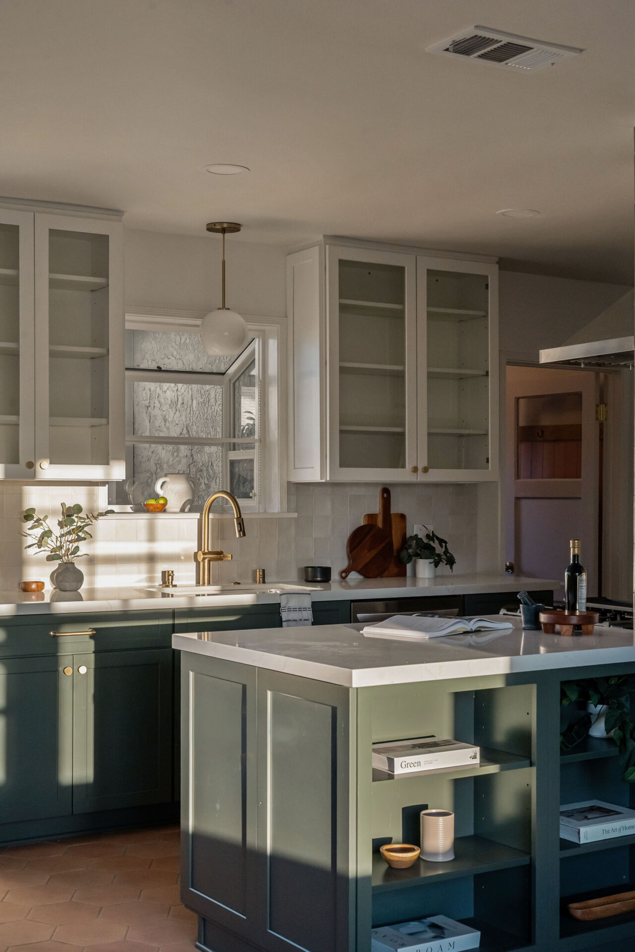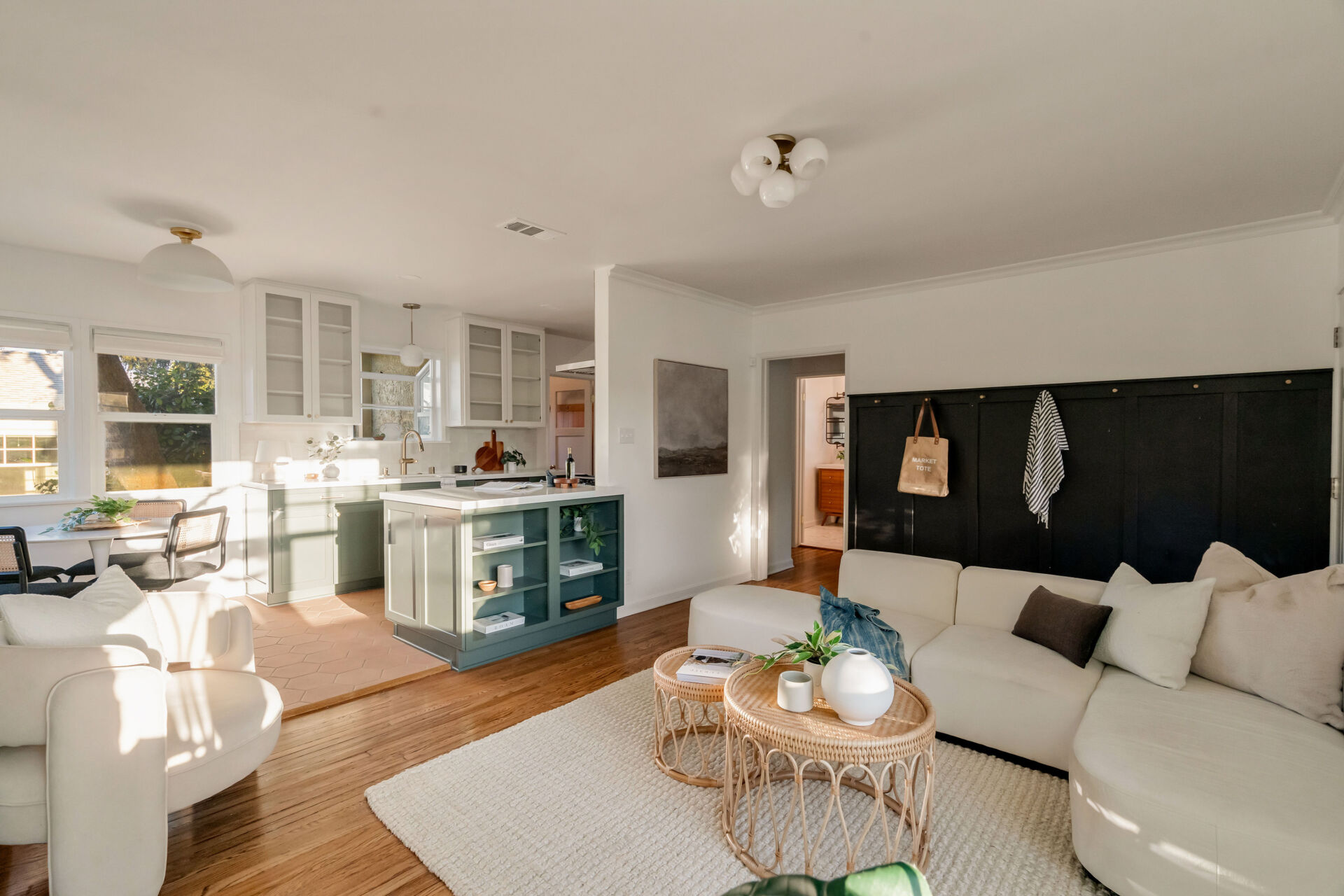 The kitchen, boasting handsome color accents, quartz counters, Cletile zellige backsplash, under-cabinet lighting, new stainless appliances including range with airfryer, custom cabinets, new brushed brass hardware, and Moen faucets, opens to a charming dining nook with new saltillo tile floors and designer chandelier.