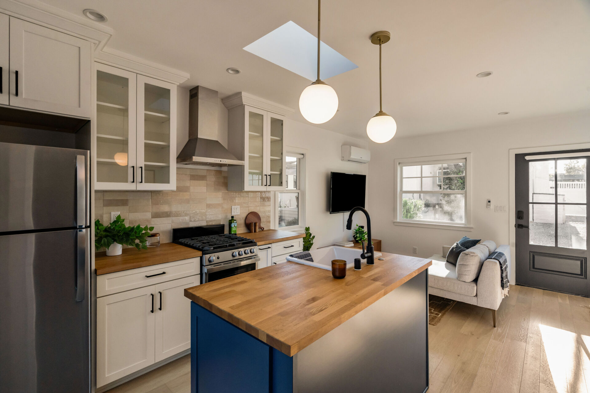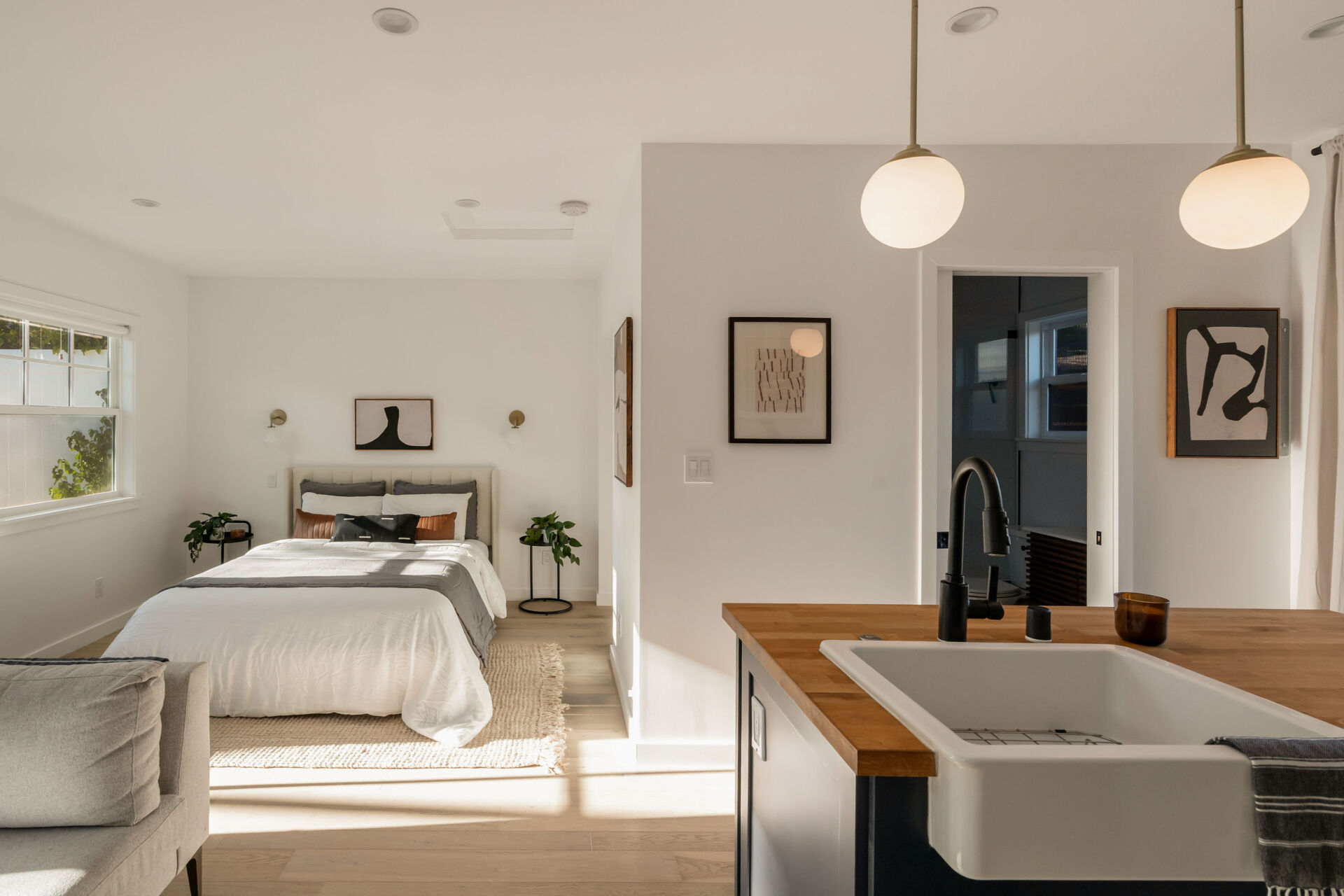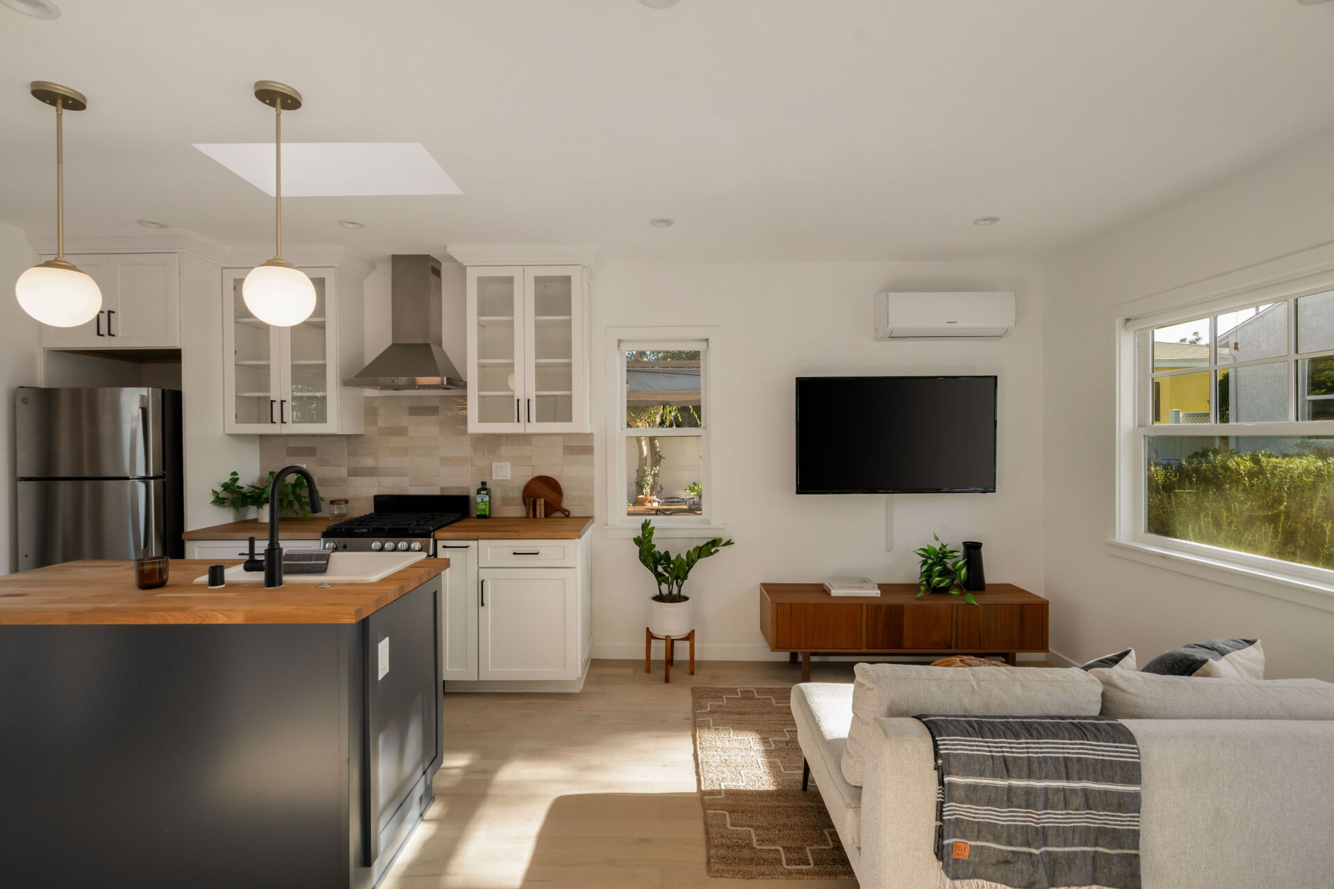 The permitted ADU, formerly the garage, is complete with engineered hardwood floors, West Elm lighting, butcher block kitchen featuring new cabinetry, matte black hardware, stainless steel appliances, plus new bathroom featuring walnut vanity, black hex tile shower and condo-size w/d.