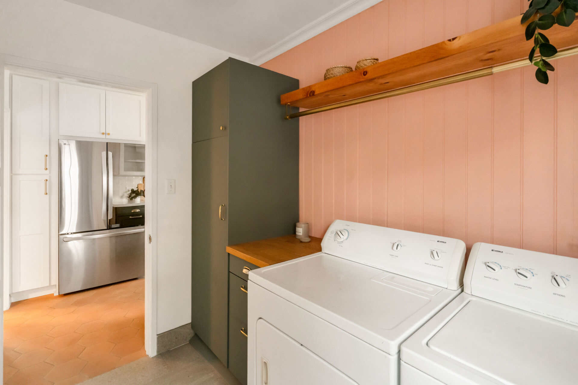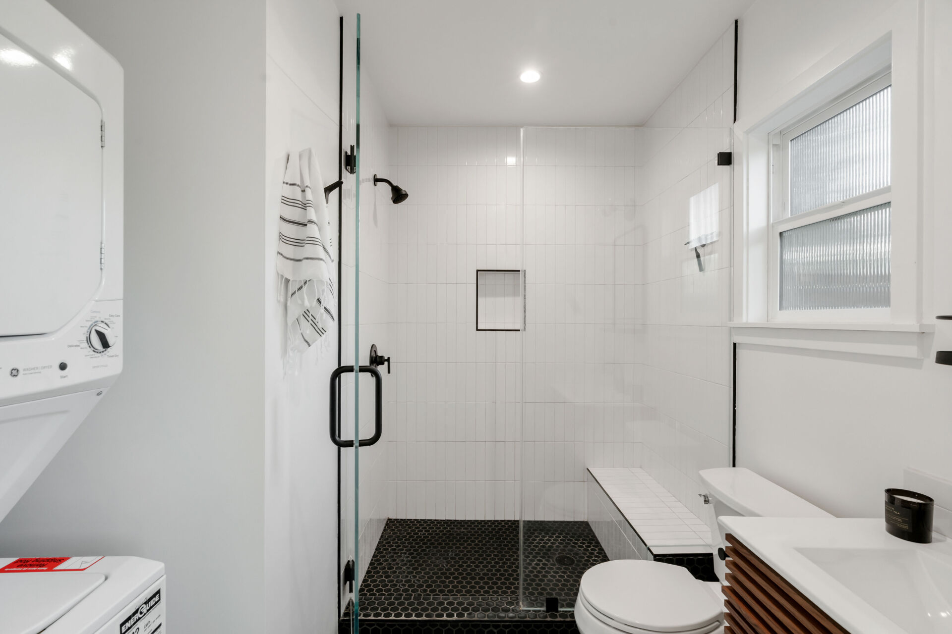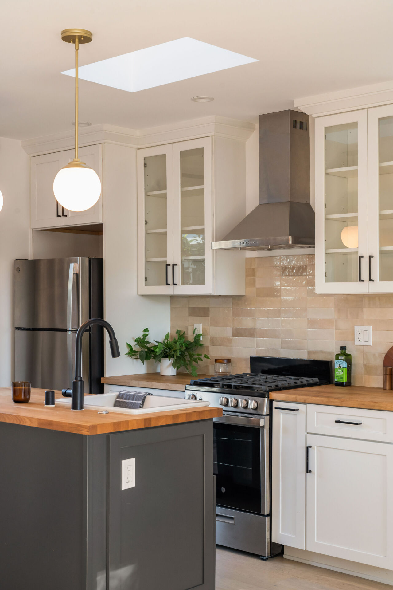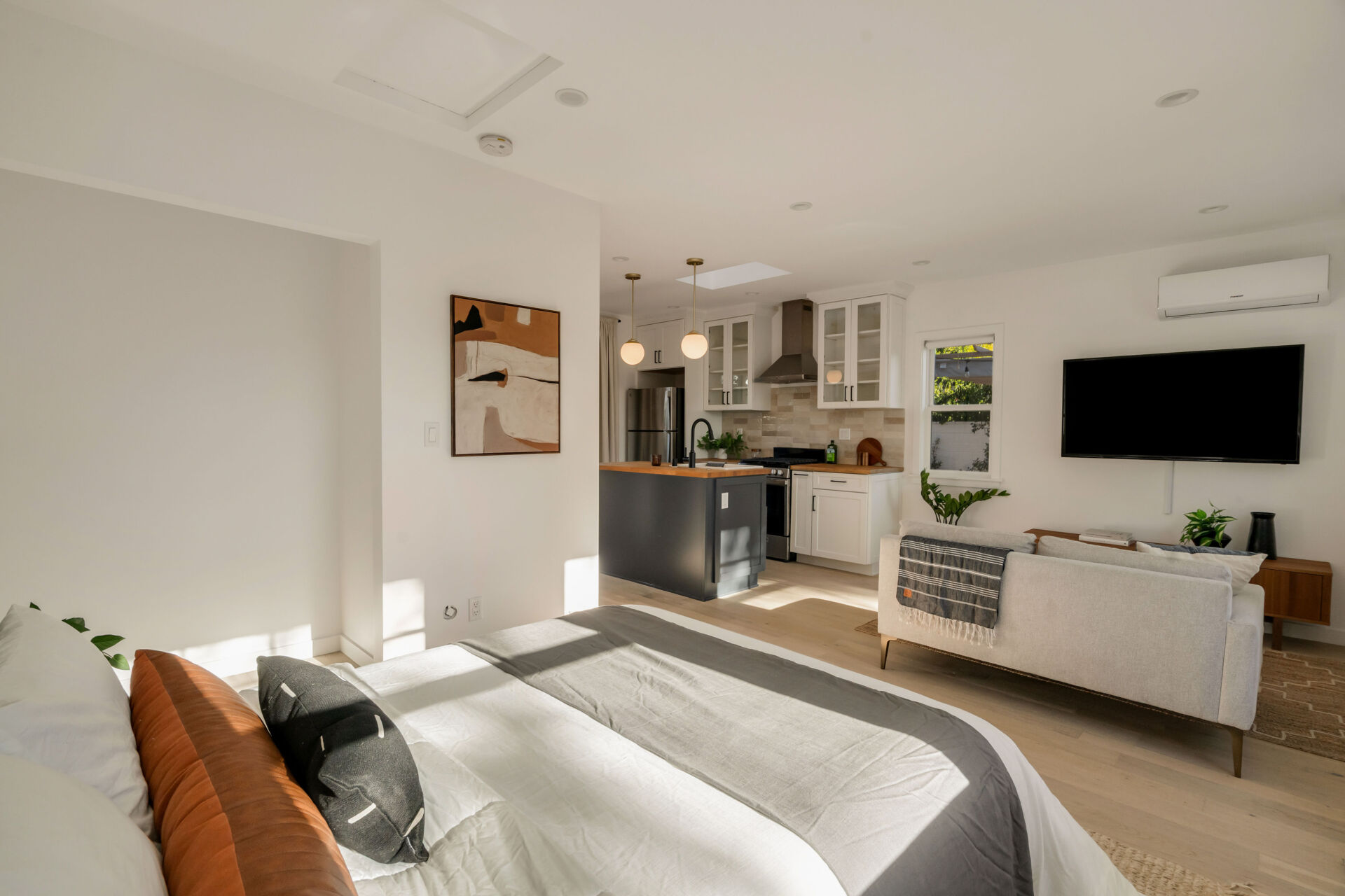 The permitted ADU, formerly the garage, is complete with engineered hardwood floors, West Elm lighting, butcher block kitchen featuring new cabinetry, matte black hardware, stainless steel appliances, plus new bathroom featuring walnut vanity, black hex tile shower and condo-size w/d.