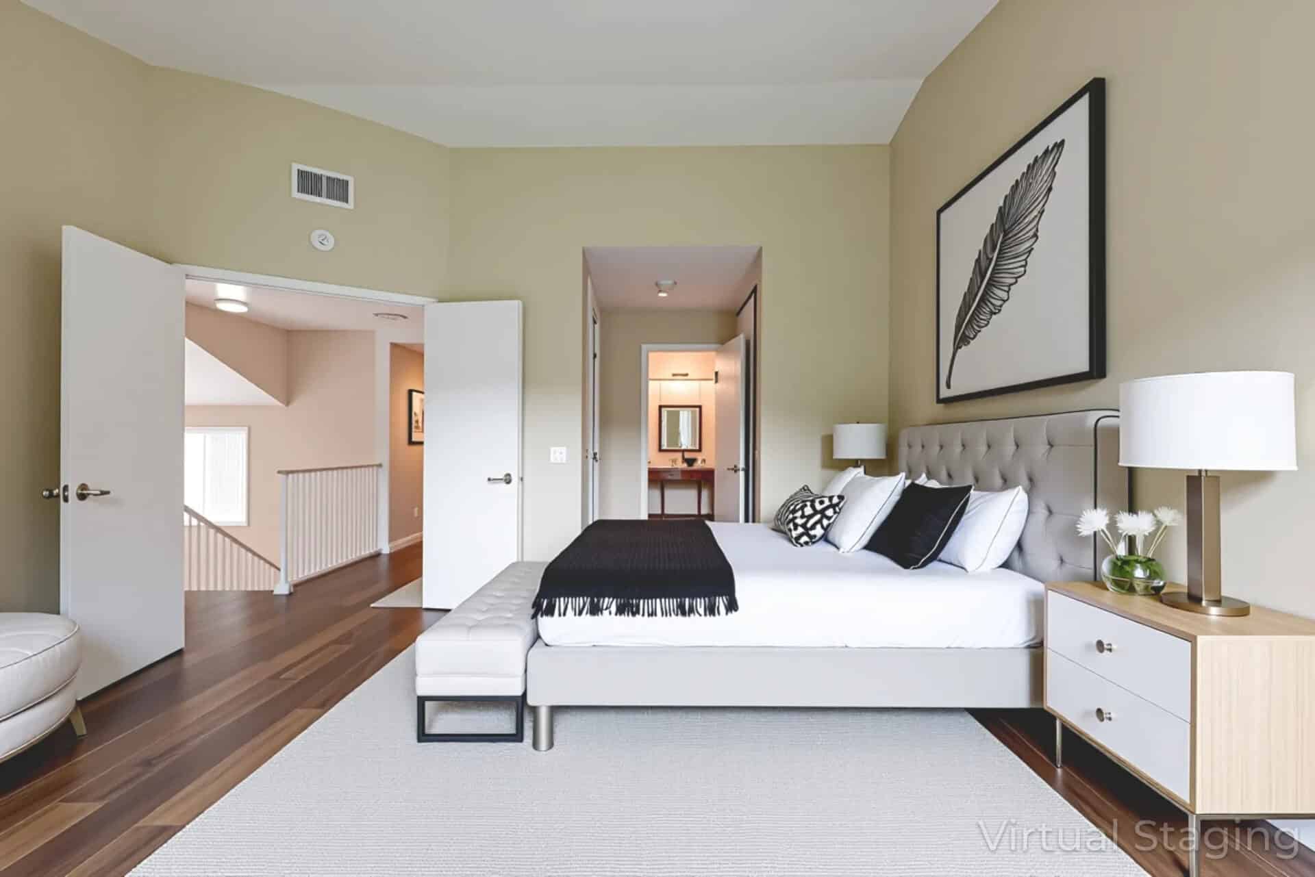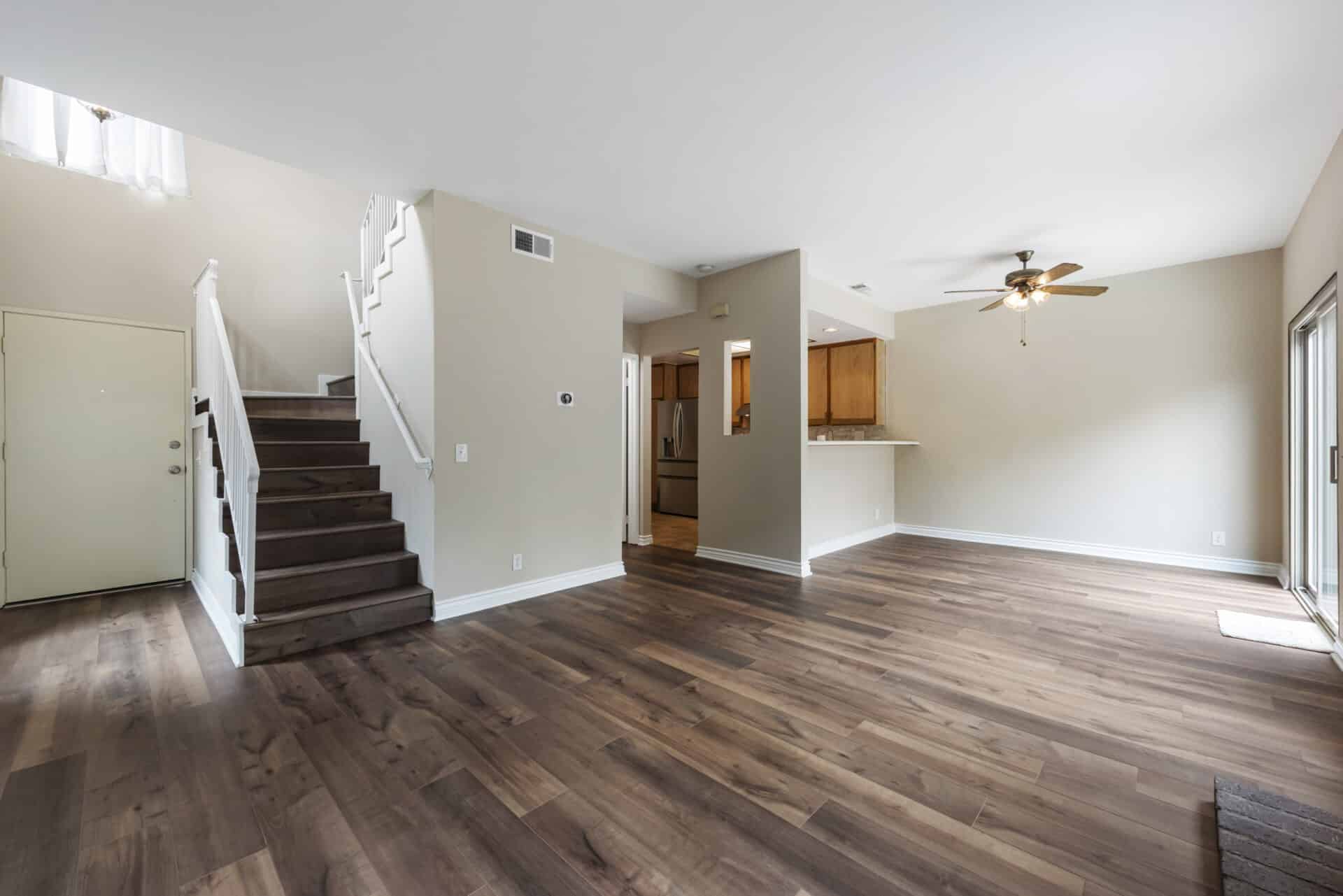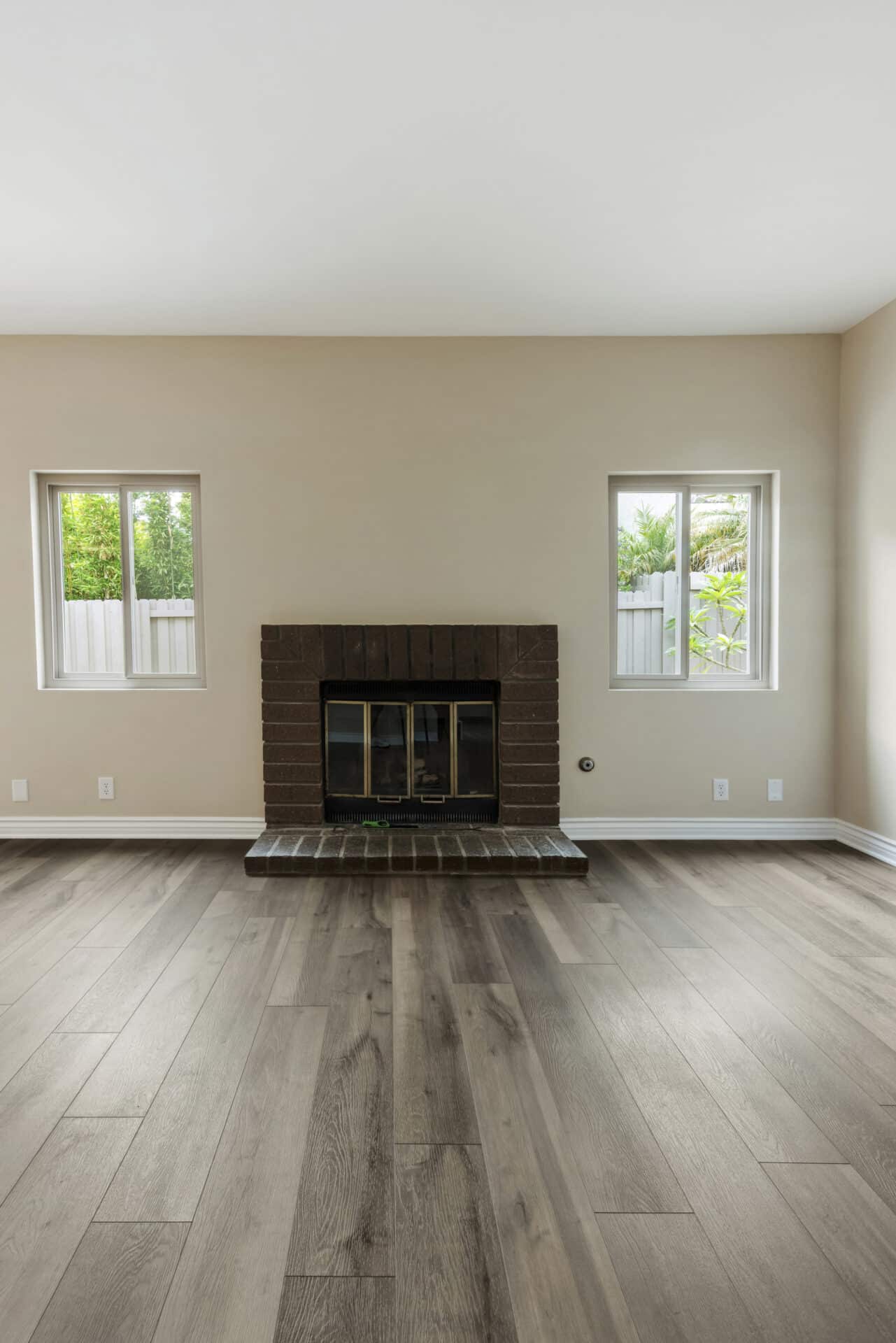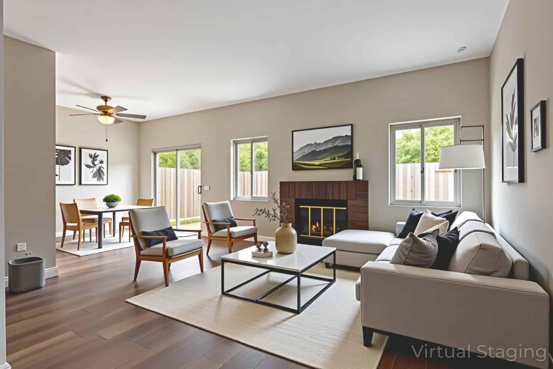The spacious living room features a cozy fireplace, perfect for relaxing evenings at home.
