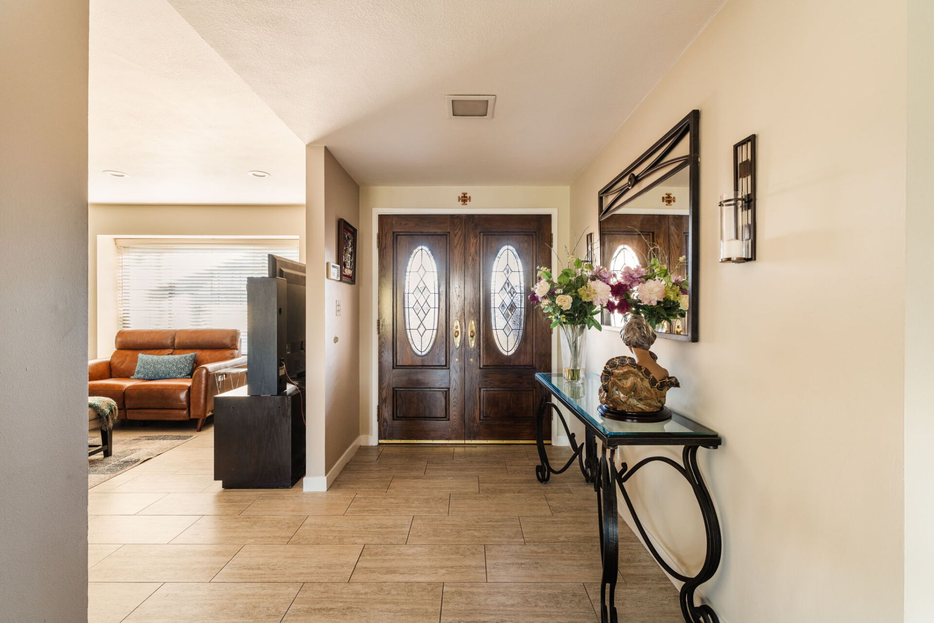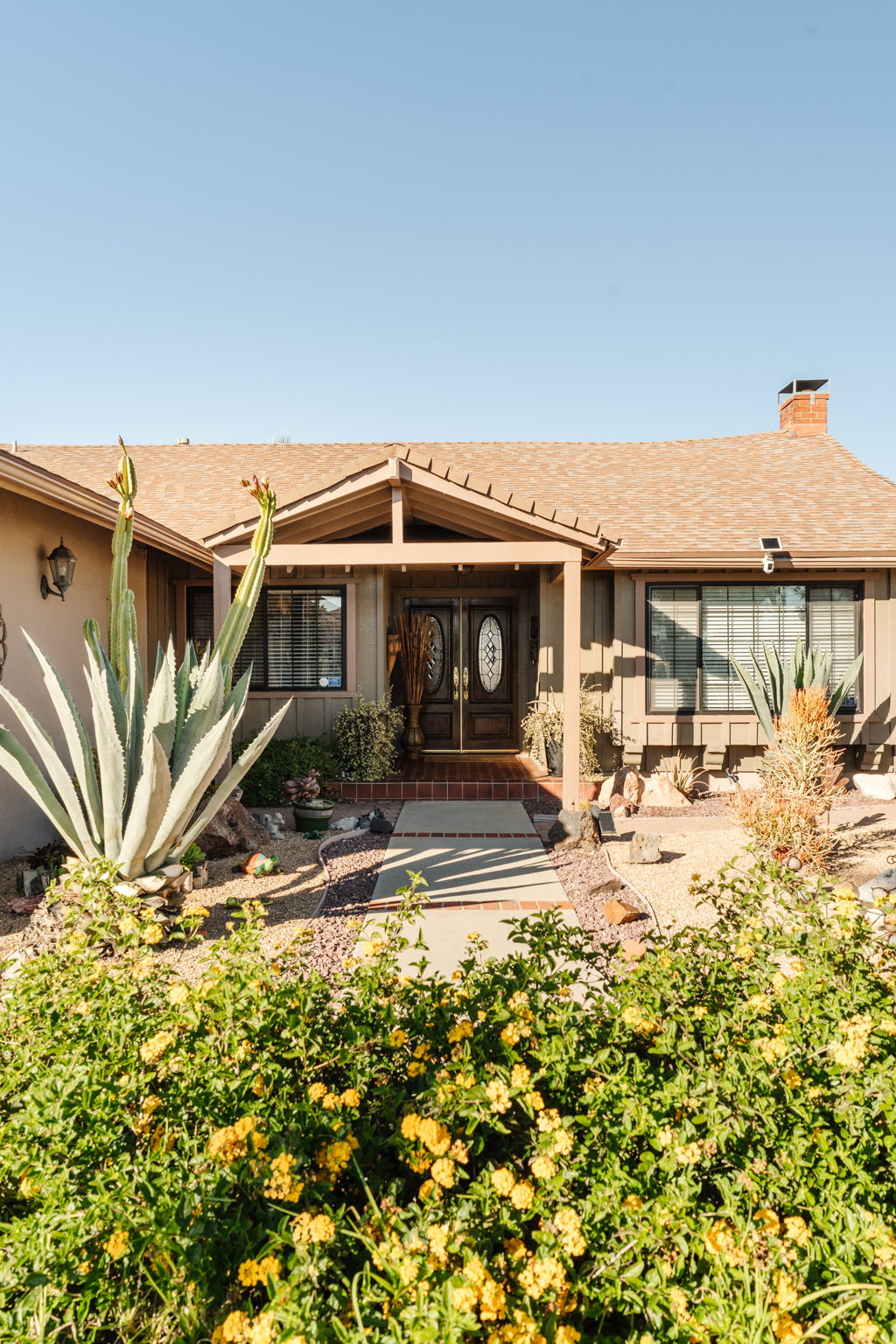 Perched lightly above the street, the home opens with double doors to sweeping hillside vistas and a sculptural front garden that feels like a living desert canvas.
