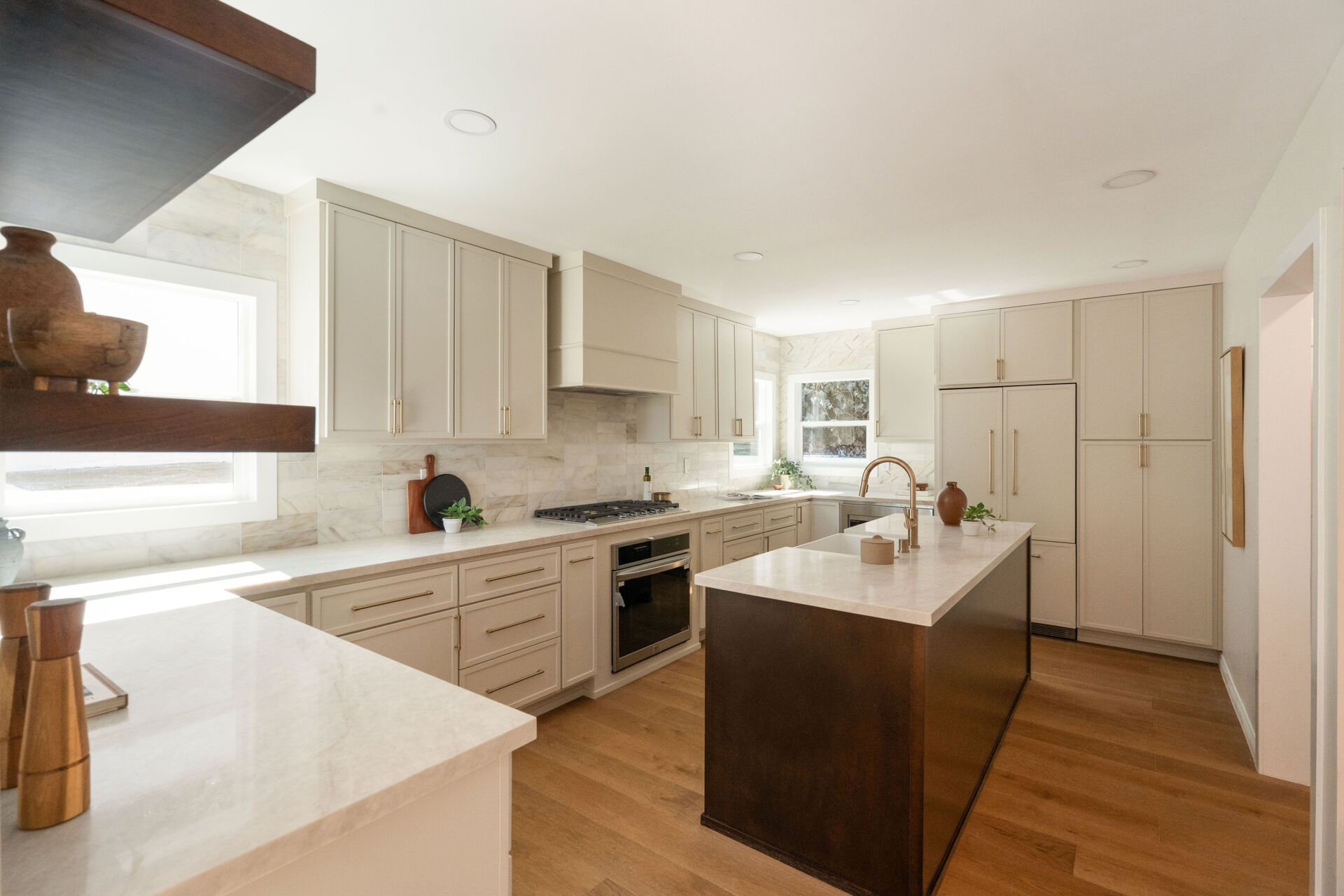 A sun-filled formal living room offers cozy fireplace and leads to the built-in dining nook, open to the ample kitchen, featuring custom cabinetry, new appliances, stone counters and a grand island for preparing a feast!