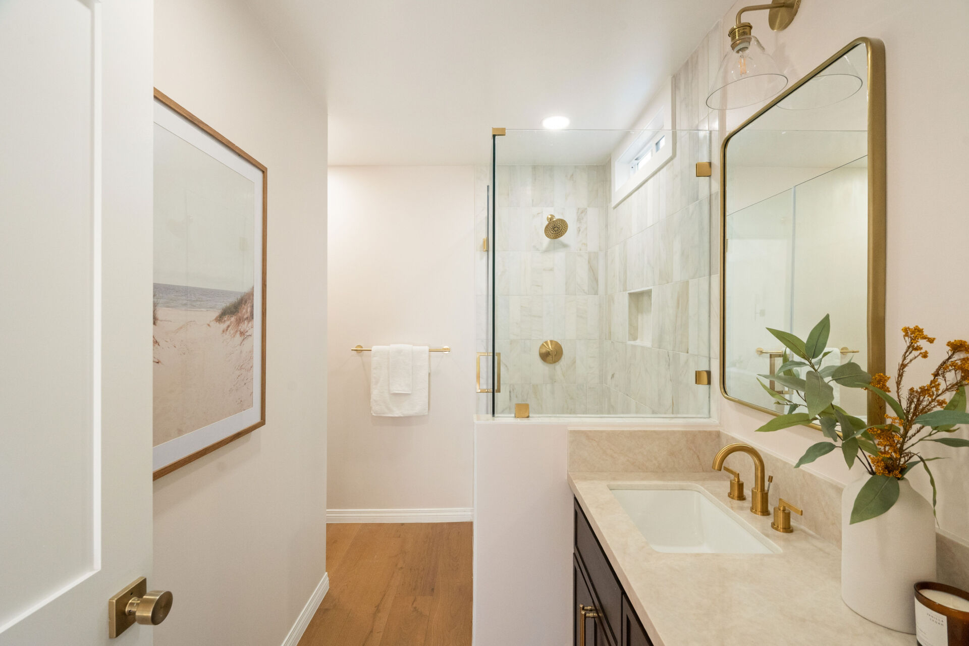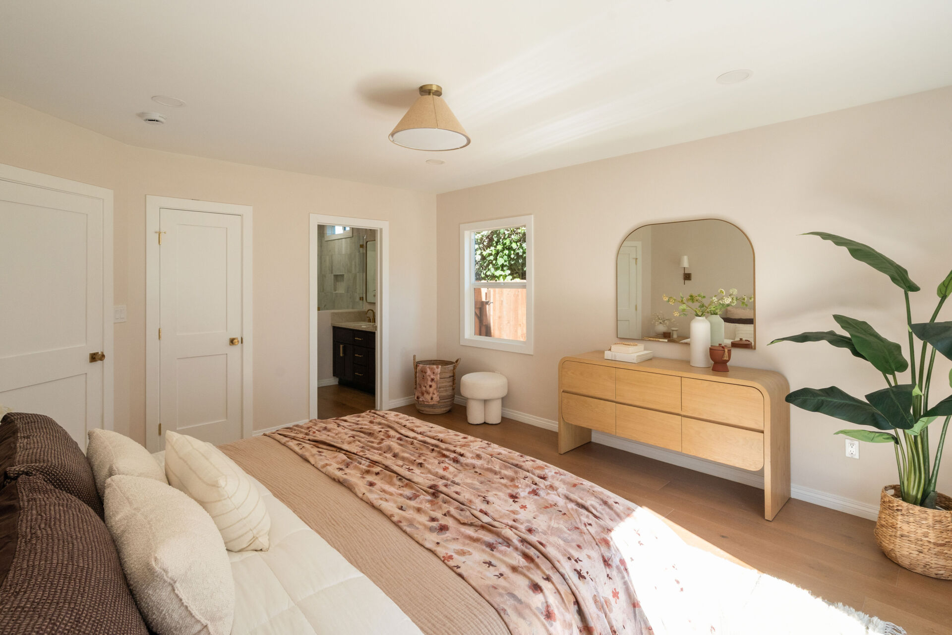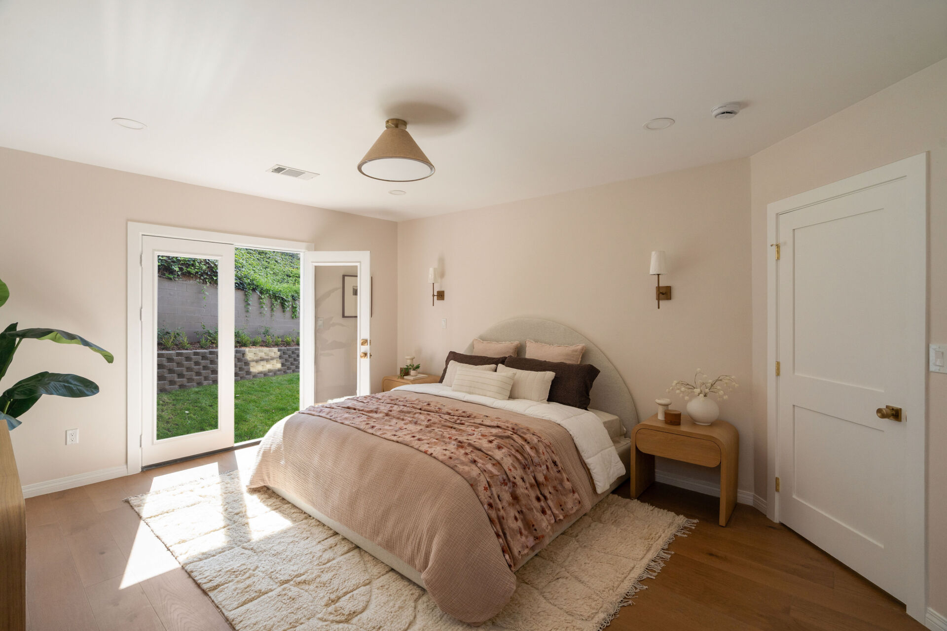 The main level primary suite is its own sanctuary, complete with a dual-vanity bath en suite, and features quartz vanities, new plumbing fixtures, and brand new tilework in the spacious shower. The primary accesses french doors to the grassy backyard for fresh air and sunlight. Two additional main level guest bedrooms offer modern lighting, ample size and great closet space.