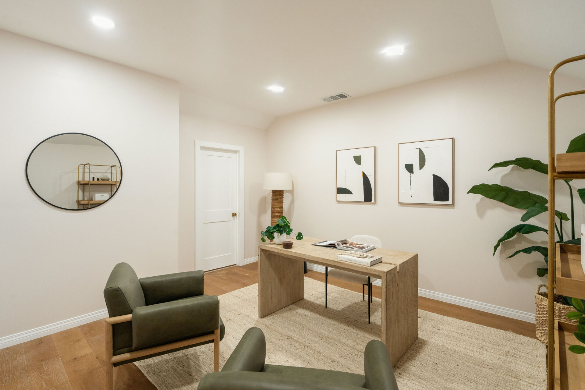 Upstairs, vaulted ceilings crown the large bonus room, creating an airy retreat that feels both expansive and intimate–is it a family room? Podcast studio? Guest suite? Also upstairs, a dedicated office offers focus and inspiration perfect for creative work or quiet reflection.