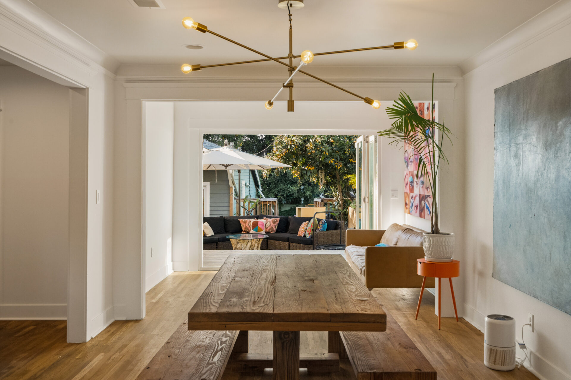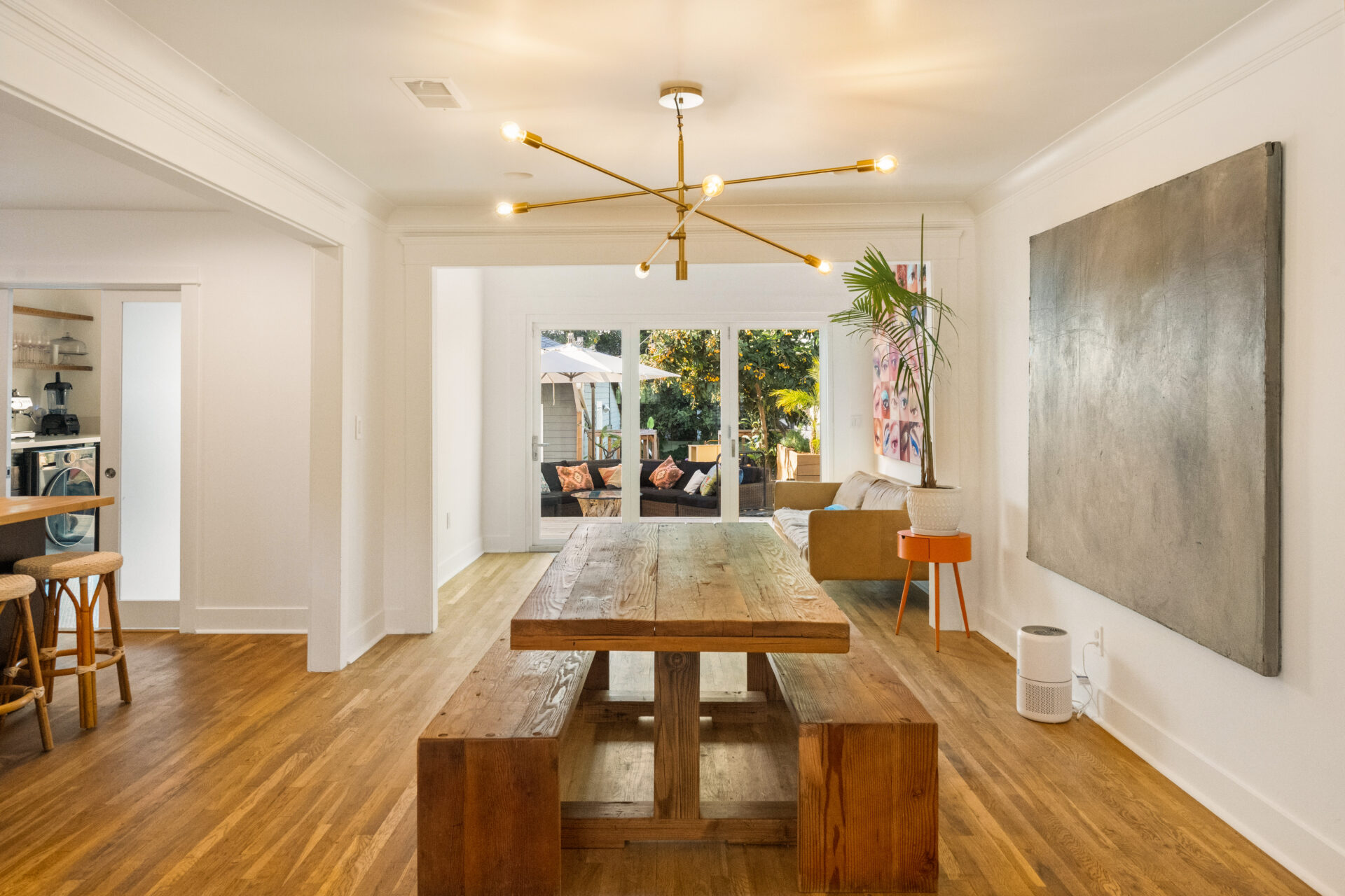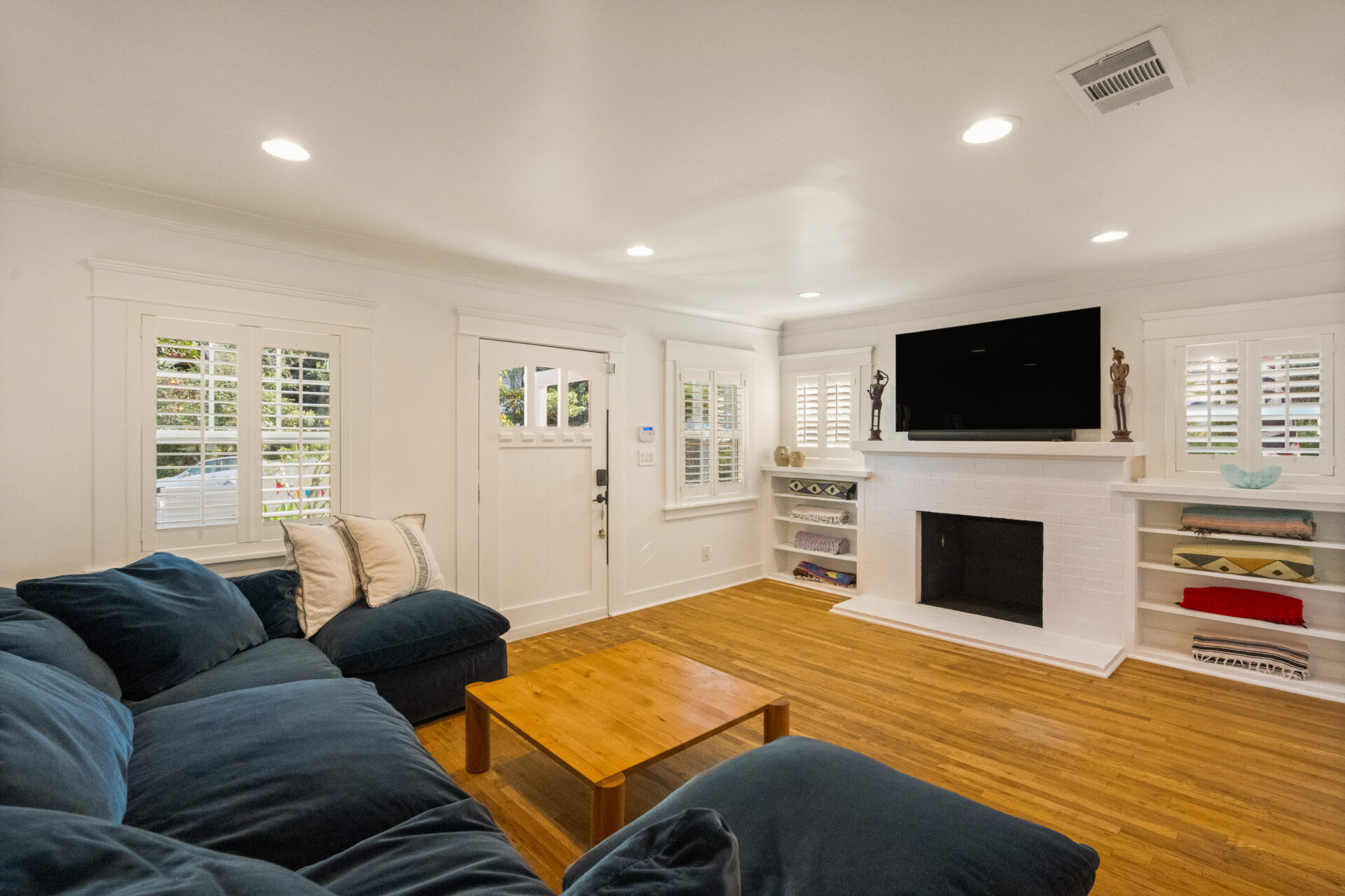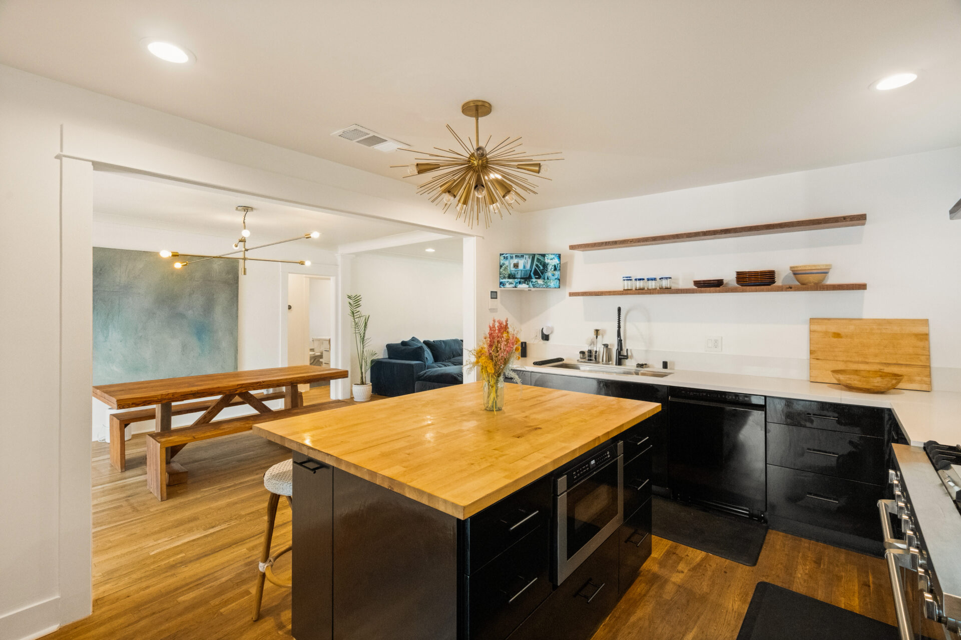 Inside, the wood-burning fireplace anchors the living room, which has a Restoration Hardware sectional, a brand new LG C5 television, and Sonos sound. The kitchen has been done properly—quartz counters, a butcher-block island, open reclaimed-wood shelving, and no bulky upper cabinets blocking the light. All appliances are new: a chef-ready stovetop with a pot-filler faucet, dual ovens, a massive sink, LG dishwasher, hidden built-in microwave, and a barkeep’s glass cleaner for the host who means business. A KitchenAid mixer, Vitamix, espresso machine, and Berkey water filtration are all here too, along with a Sonos speaker and a Smart TV for streaming or keeping an eye on the security cameras. The formal dining room sits just off the kitchen—a proper space for dinner parties, and in this neighborhood, there will be plenty.