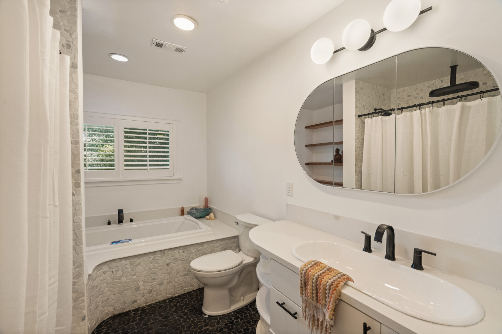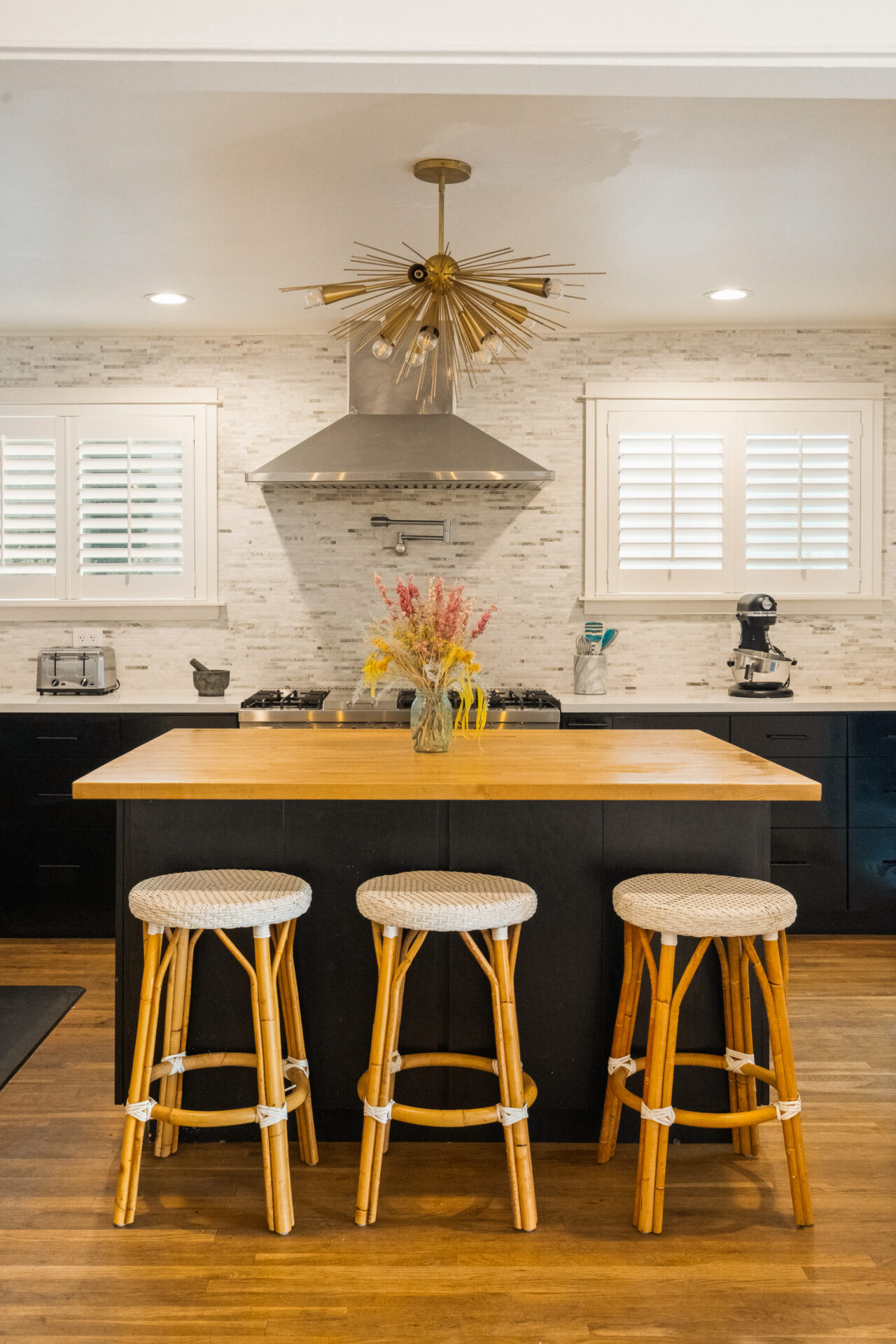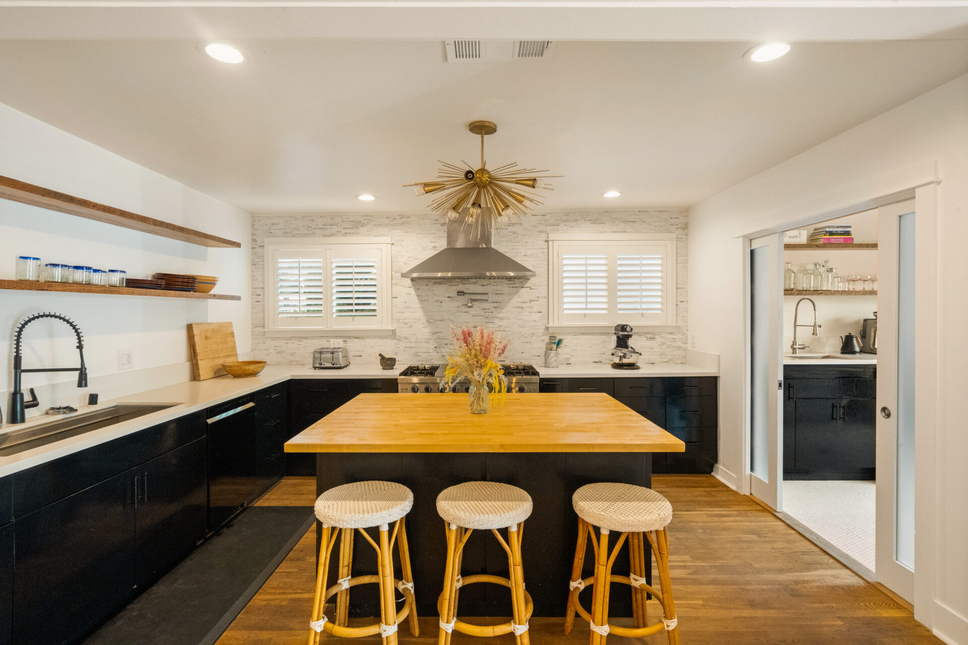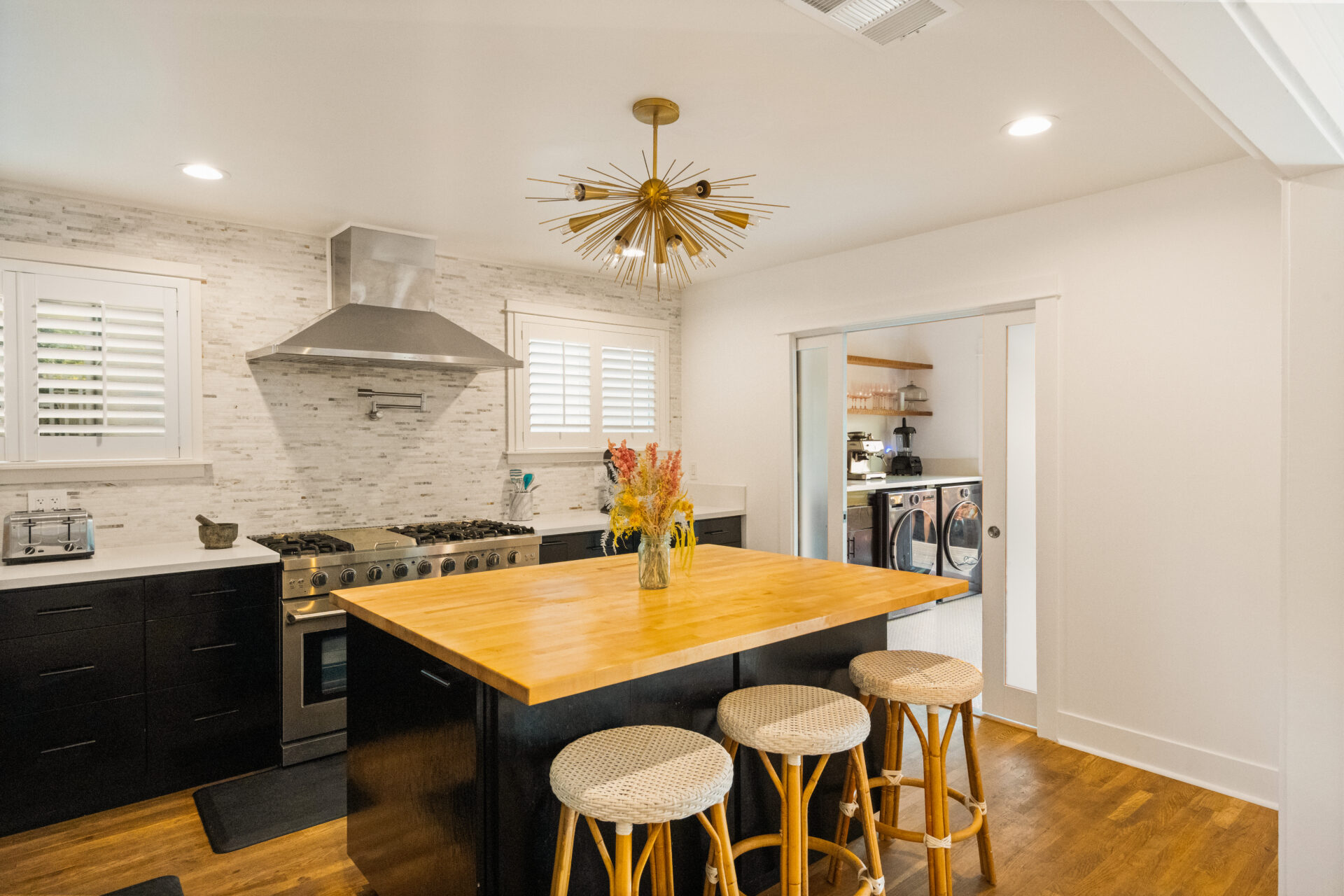 Inside, the wood-burning fireplace anchors the living room, which has a Restoration Hardware sectional, a brand new LG C5 television, and Sonos sound. The kitchen has been done properly—quartz counters, a butcher-block island, open reclaimed-wood shelving, and no bulky upper cabinets blocking the light. All appliances are new: a chef-ready stovetop with a pot-filler faucet, dual ovens, a massive sink, LG dishwasher, hidden built-in microwave, and a barkeep’s glass cleaner for the host who means business. A KitchenAid mixer, Vitamix, espresso machine, and Berkey water filtration are all here too, along with a Sonos speaker and a Smart TV for streaming or keeping an eye on the security cameras. The formal dining room sits just off the kitchen—a proper space for dinner parties, and in this neighborhood, there will be plenty.