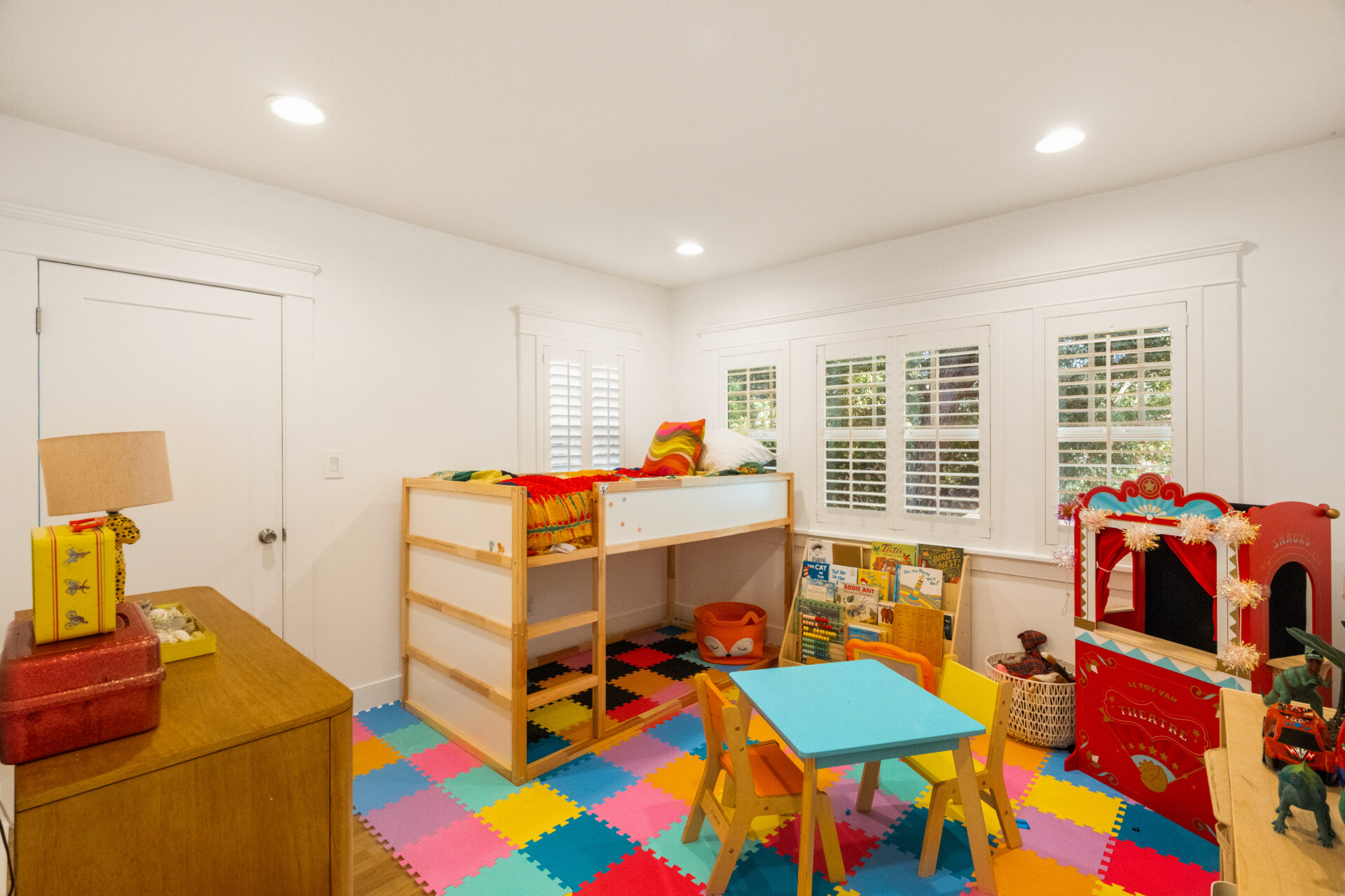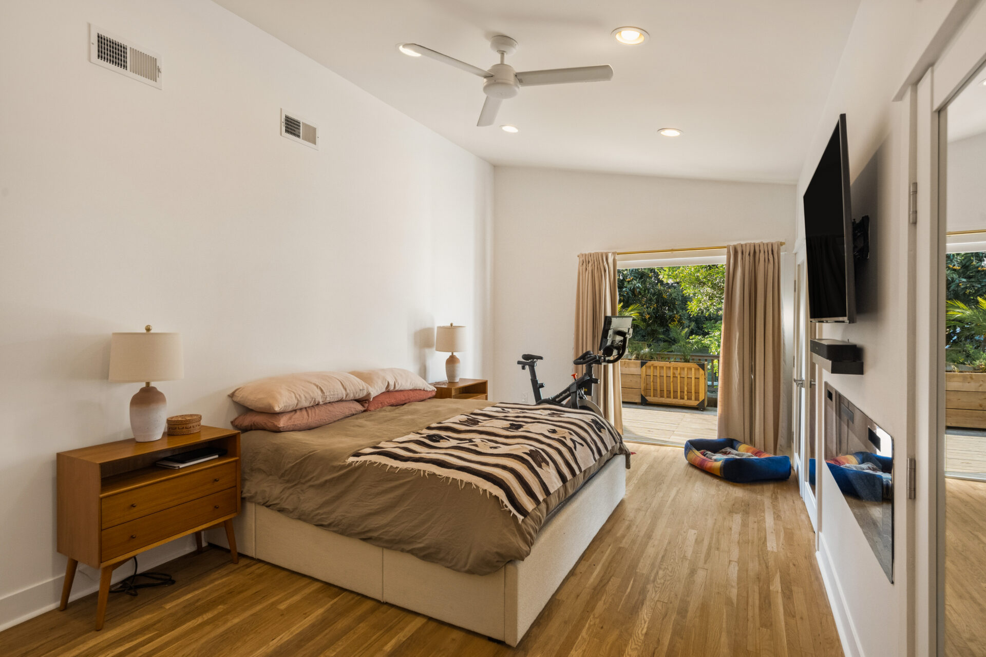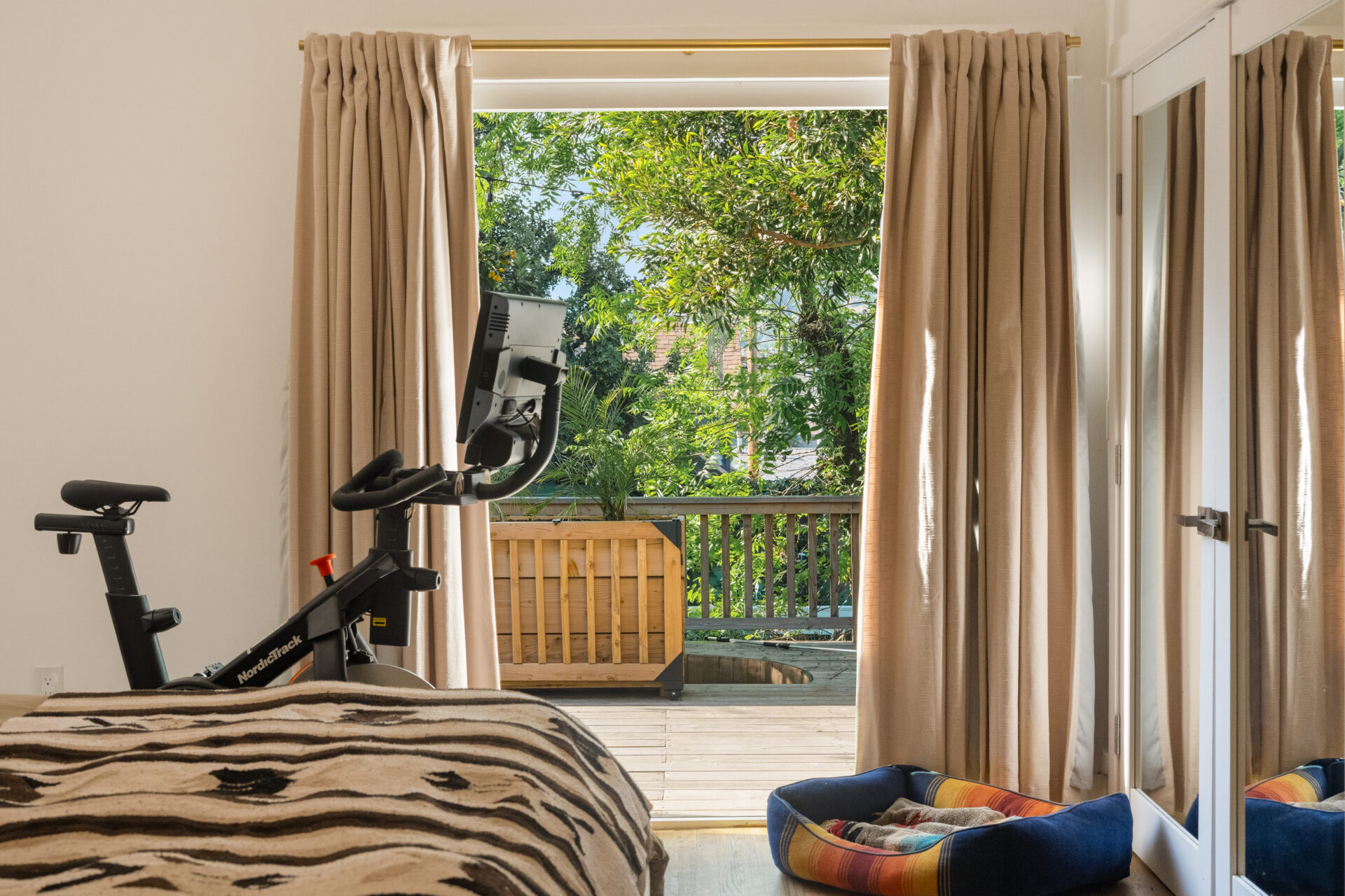 The primary suite has a brand new king bed with mid-century nightstands and dresser, a huge adaptable closet, a built-in emission-free customizable fireplace, Sonos, a streaming TV, and an exercise bike, weights, and yoga mats for the mornings you actually mean to use them. The Cantina doors open straight out to the private cedar hot tub. The kids’ room has a bunk bed, dresser, and toy shelves—or clear it all out and put it in storage if you’d rather use the room for something else entirely.