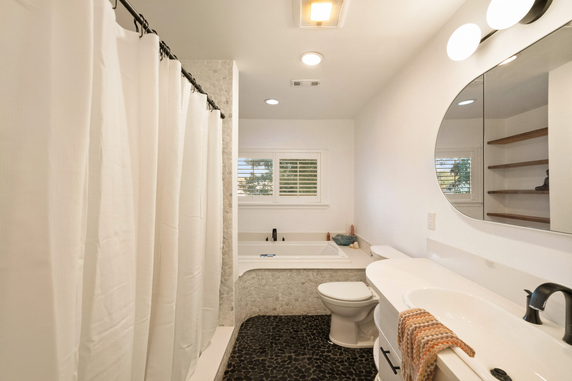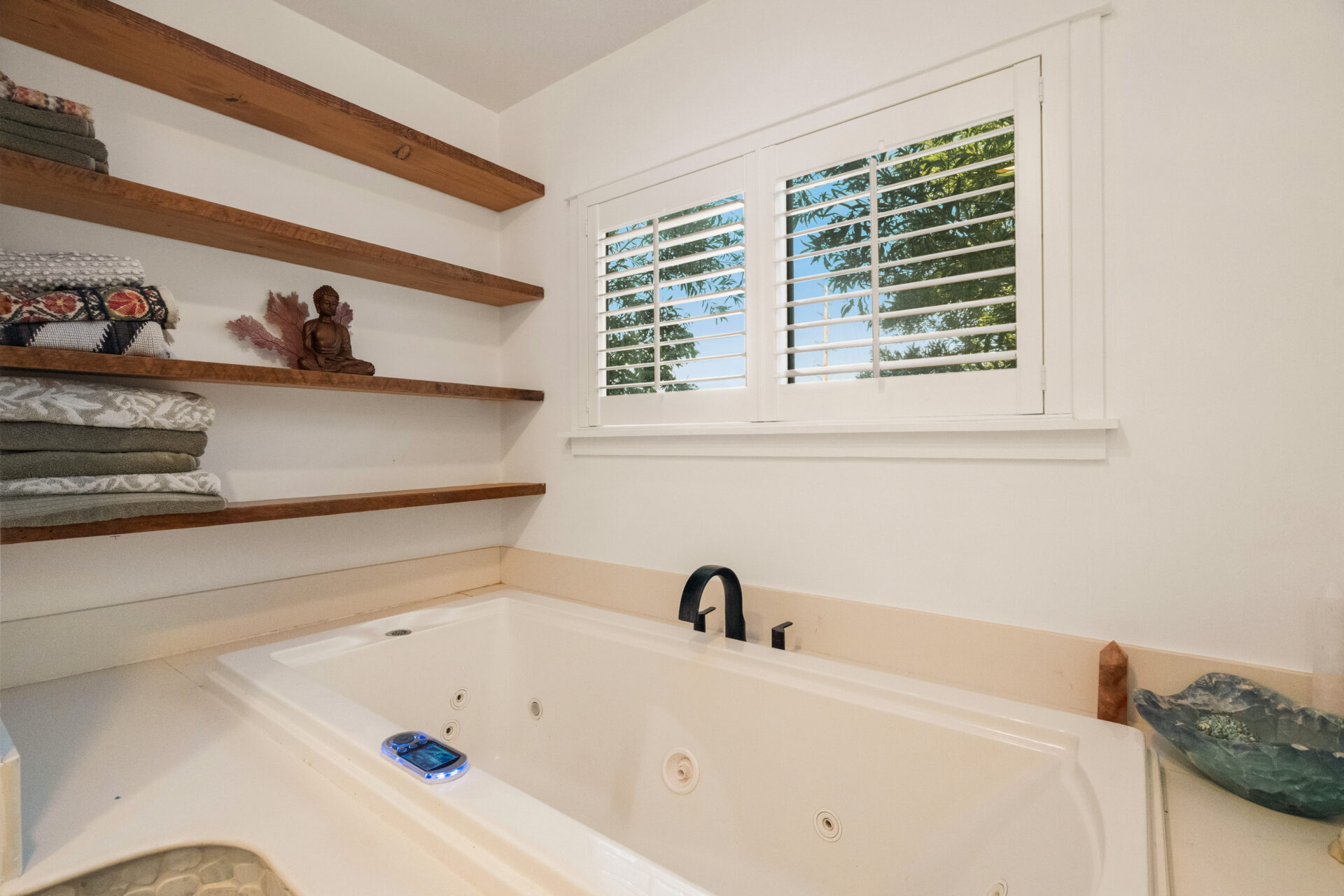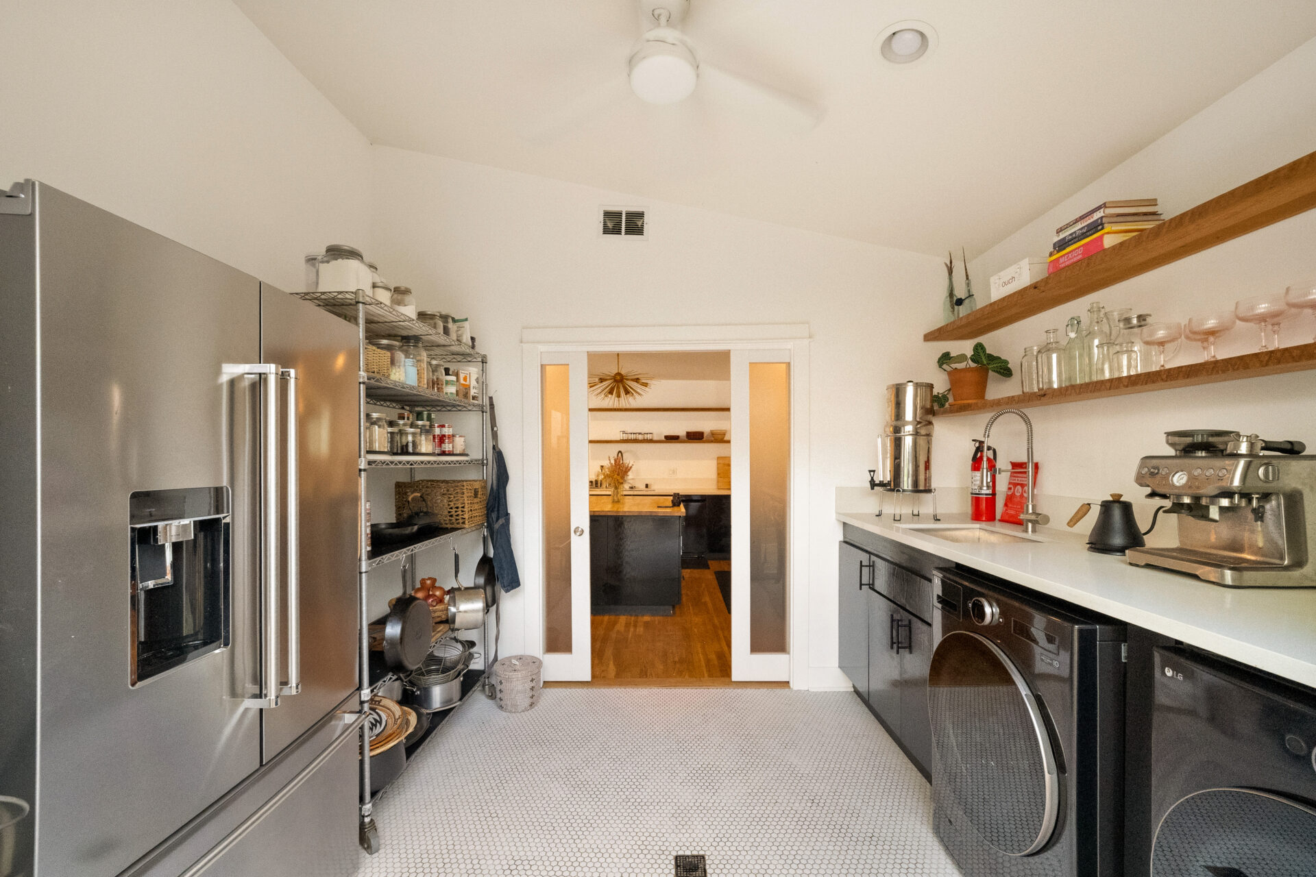 The pantry and laundry room is stocked with a brand new fridge, washer, and dryer, open reclaimed shelving, large industrial shelving, and its own Sonos speaker. The bathroom has a Kohler steam shower, Jacuzzi soaking tub, quartz counters, open reclaimed-wood shelves, and a large vanity.