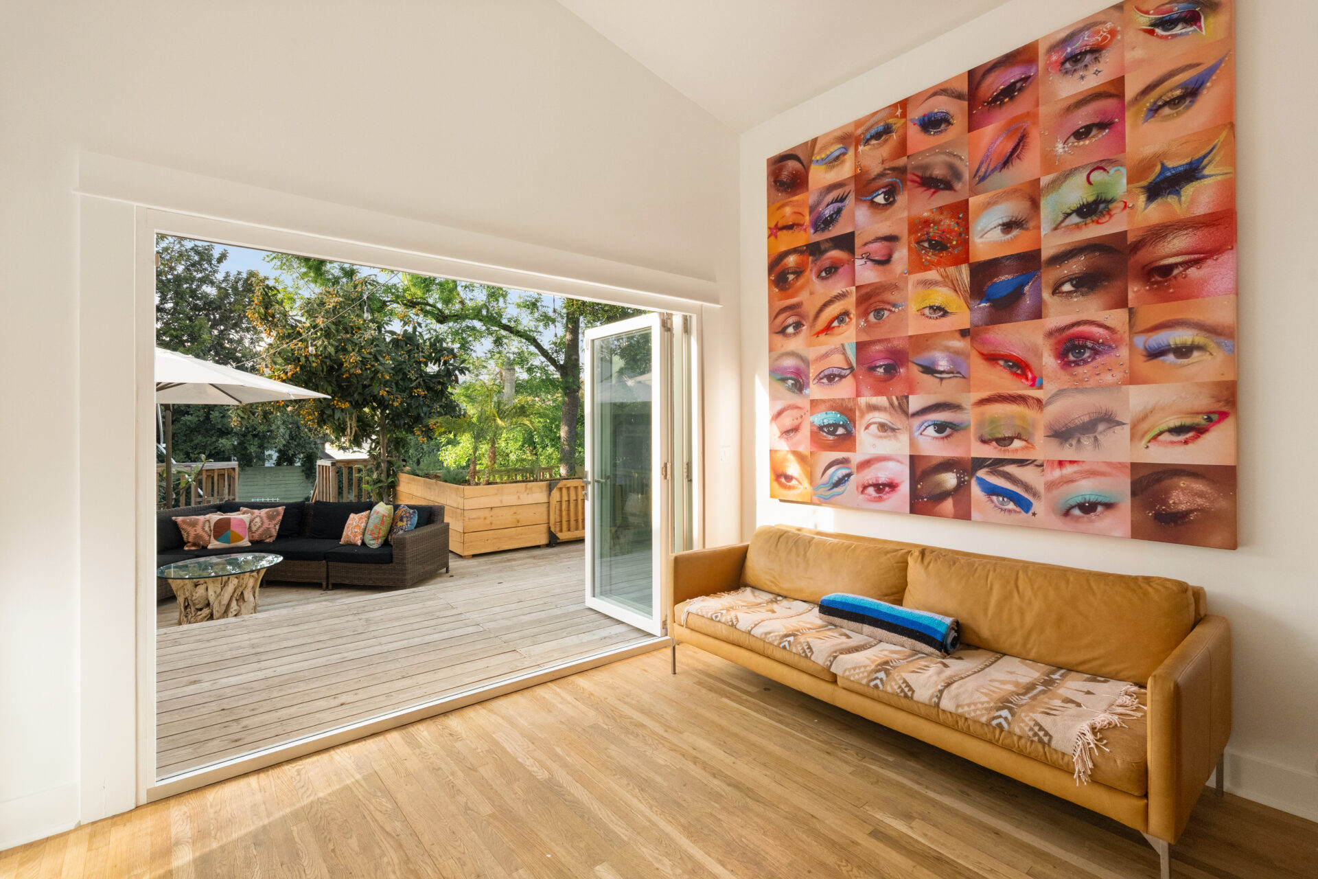 Out back, the main deck is built for long evenings: a Pottery Barn sectional, overhead string lights, Philips Hue accent lighting, built-in planters on an automated drip system, propane heaters for cooler nights, an outdoor dining set, and a handmade freshwater cedar hot tub from Oregon. The detached office earns its reputation as the best room on the property—a library and screening room in one, with a plug-and-play desk setup, 38″ curved ultra-wide monitor, Epson projector, 100″ screen, and LG surround sound, plus its own secluded back deck and garden that makes it easy to lose track of time.