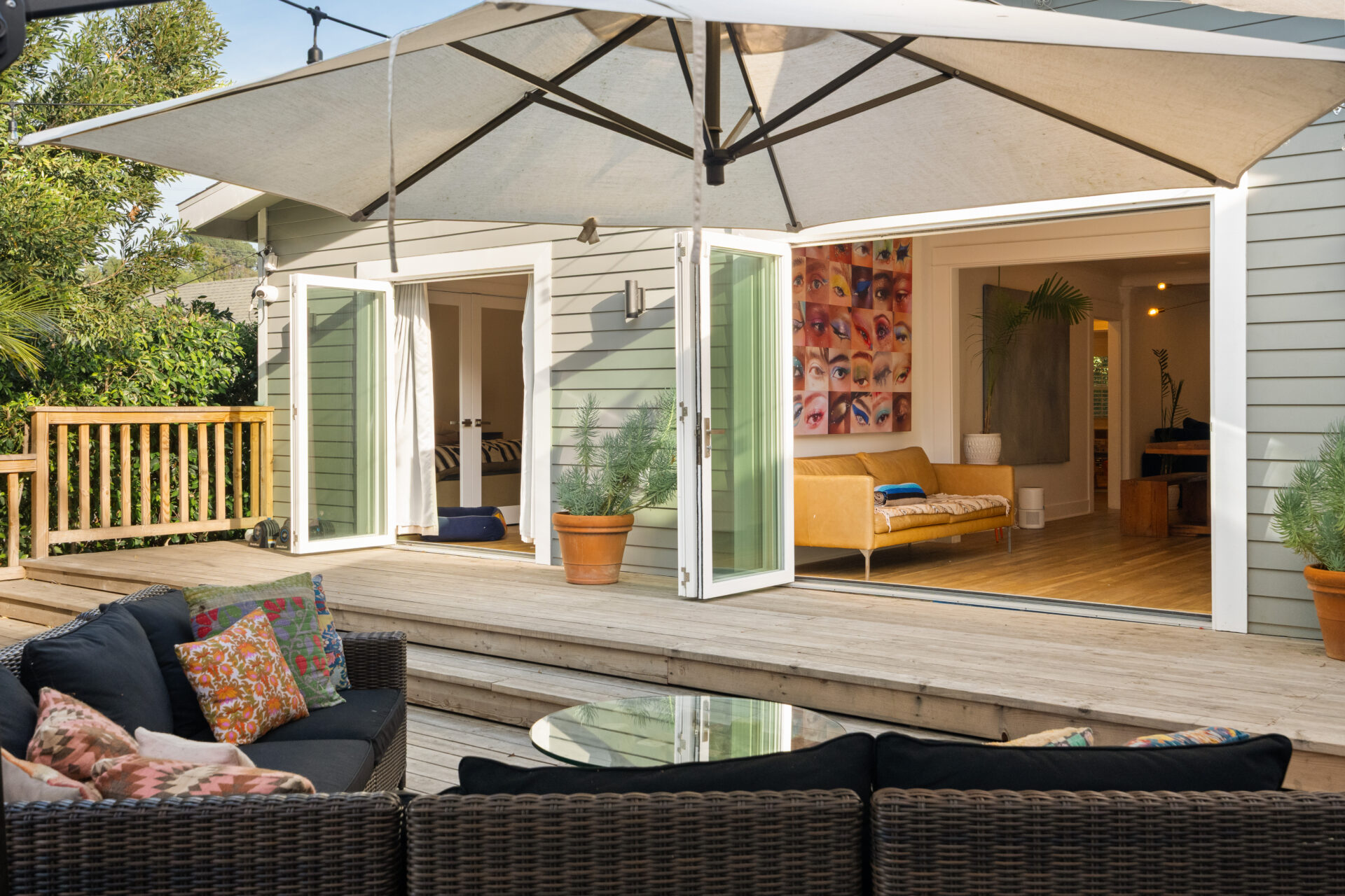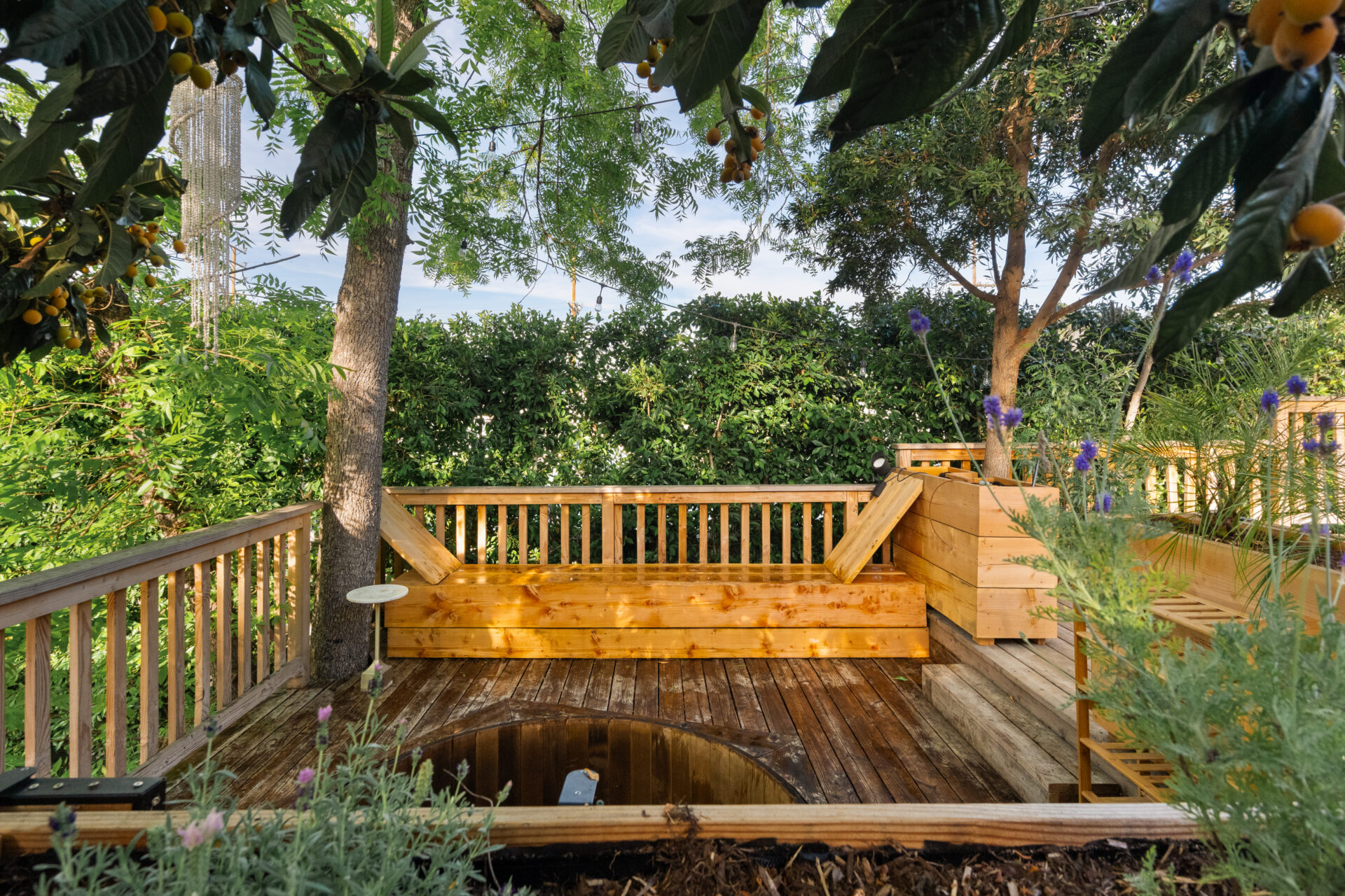 Out back, the main deck is built for long evenings: a Pottery Barn sectional, overhead string lights, Philips Hue accent lighting, built-in planters on an automated drip system, propane heaters for cooler nights, an outdoor dining set, and a handmade freshwater cedar hot tub from Oregon.
