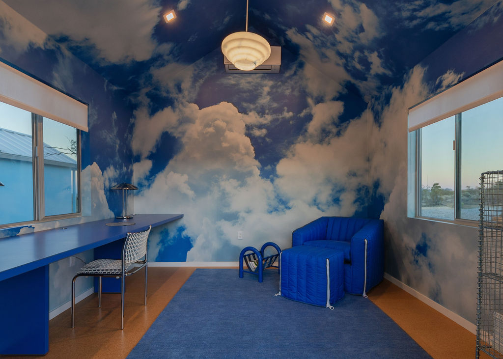 Interiors showcase custom cabinetry, cork flooring, all dimmable restored vintage and designer lighting, and a restored vintage gas-burning Malm fireplace in the sunroom of main house. The main house kitchen blends form and function with Bertazzoni, Bosch, and Summit appliances, and Cambria quartz counters. A charming sunsplashed dining nook is the perfect spot for sipping morning coffee. The primary bath features a Peter Shire toilet seat and custom pulls by Chen Chen & Kai Williams. The newly converted 2025 ADU features vaulted ceilings, porcelain Daltile, marble vanity, plus independent new septic system. One studio serves as an office wrapped in a cloud mural designed by Another Human; the other is currently an art studio but the possibilities are endless–yoga, podcast, work from home! Outdoors, native Joshua Trees envelop the property, plus enjoy San Pedro cactus, Ipe wood decking, a cowboy tub, new Jacuzzi hot tub, and original outdoor hearth to shape a sculptural desert retreat. Enjoy picnic table dining under the stars! Additional systems improvements include: new fiber internet, new minisplits, updated foundation/footings, new Rheem water heater, and new GE washer/dryer. Can be sold furnished for an additional fee, including custom pieces designed by Another Human. Lavender Ranch stands as a landmark of California design and one of the high desert’s most distinct design properties.