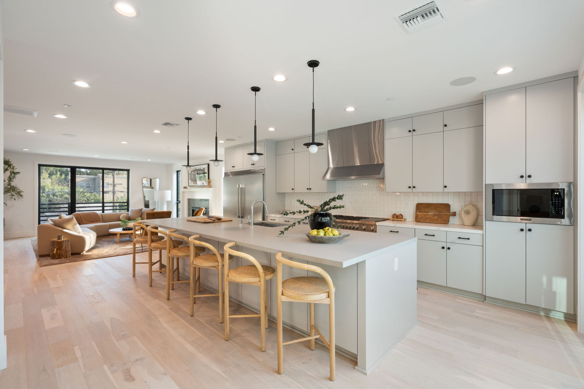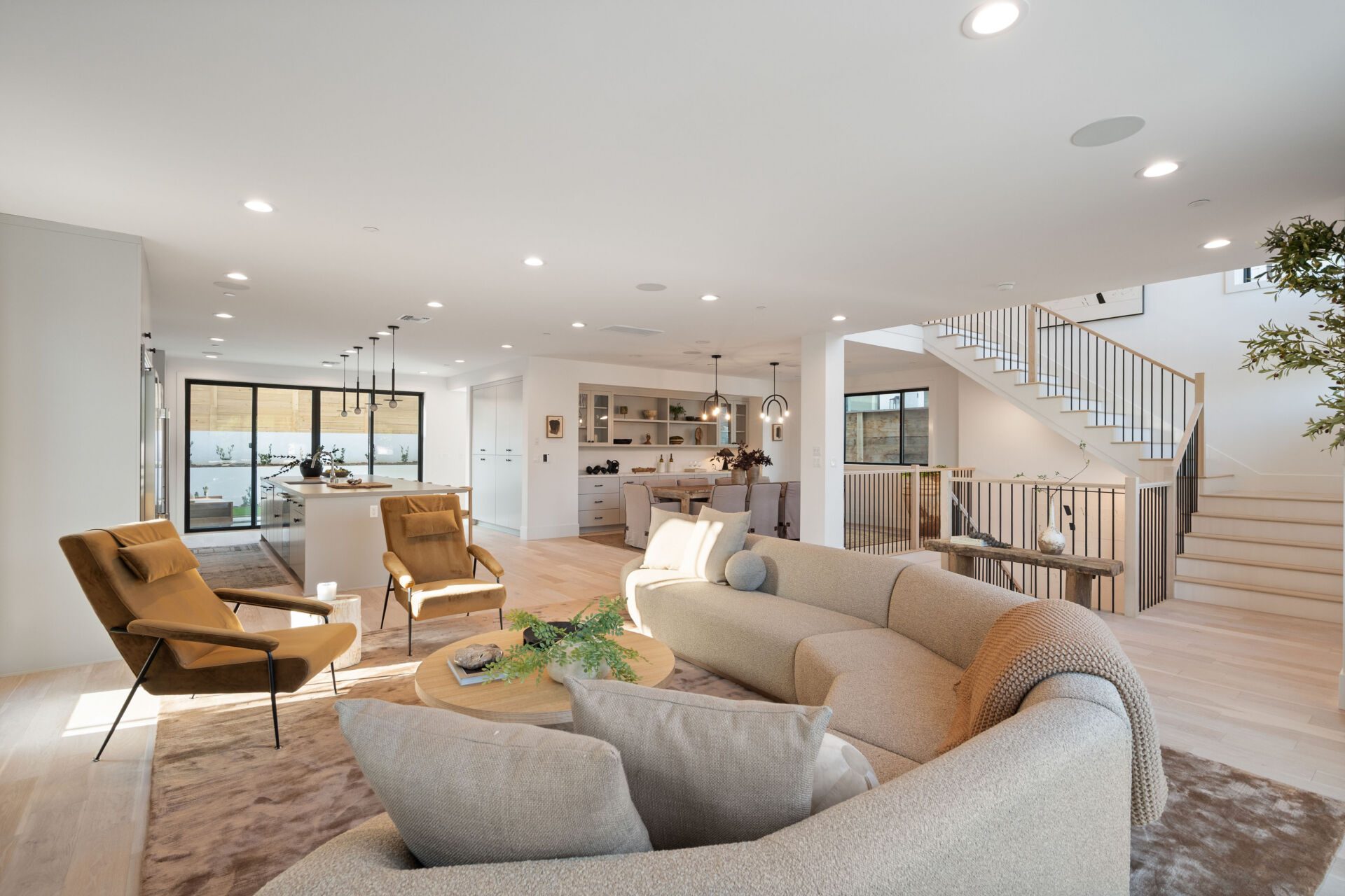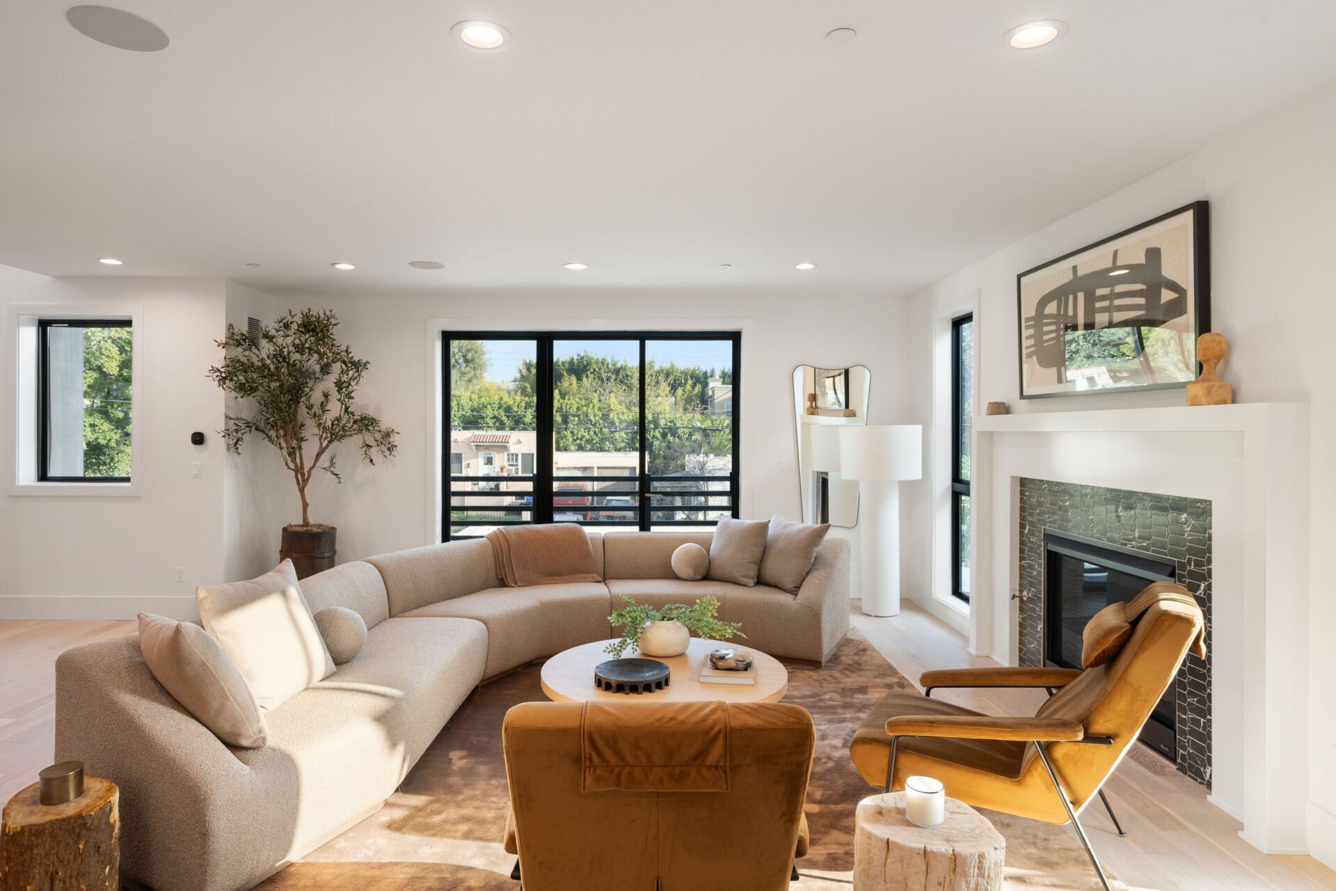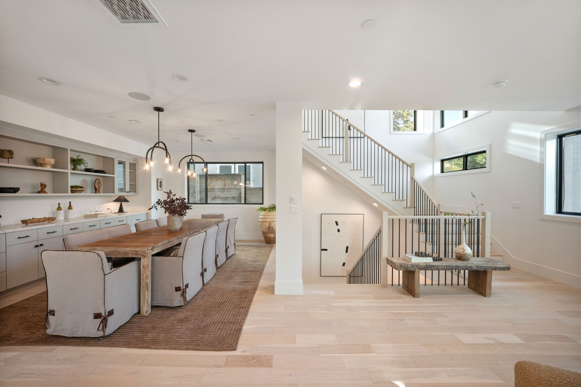 A dramatic staircase leads to a sunlit living room with a modern fireplace, complemented by a dedicated dining area that flows effortlessly into the heart of the home. The gourmet kitchen is an entertainer’s dream, featuring an oversized island, Bertazzoni range, abundant storage, and custom cabinetry. Soaring ceilings and a timeless architectural aesthetic create a sense of volume and light throughout. Expansive sliding glass doors open to a sun-kissed yard and alfresco dining terrace, offering seamless indoor-outdoor living. Every detail has been thoughtfully curated to balance culinary creativity with luxurious comfort.
