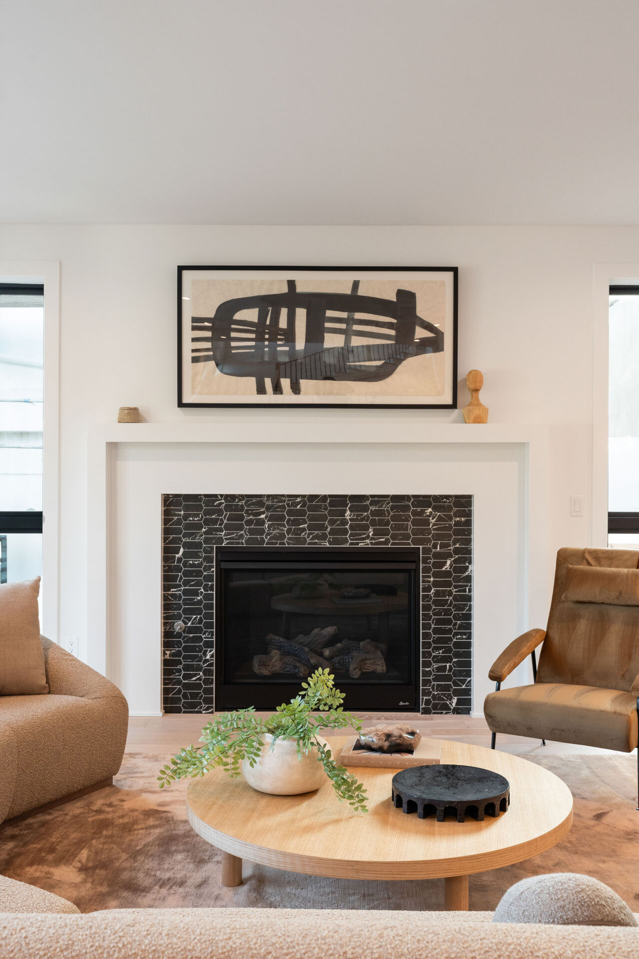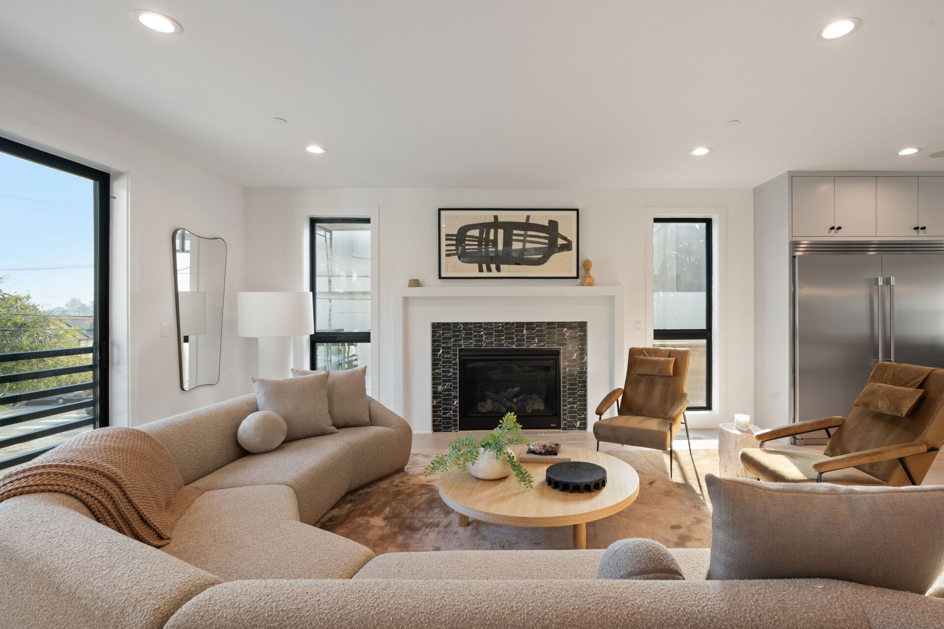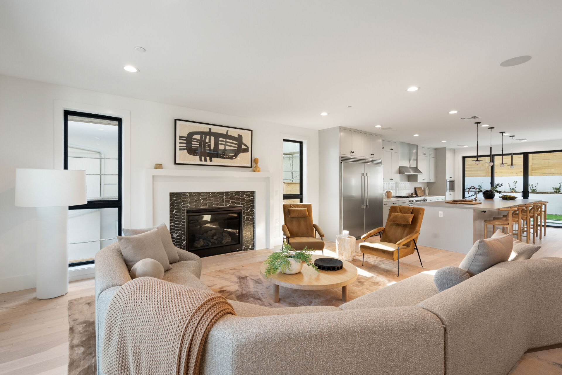 A dramatic staircase leads to a sunlit living room with a modern fireplace, complemented by a dedicated dining area that flows effortlessly into the heart of the home.