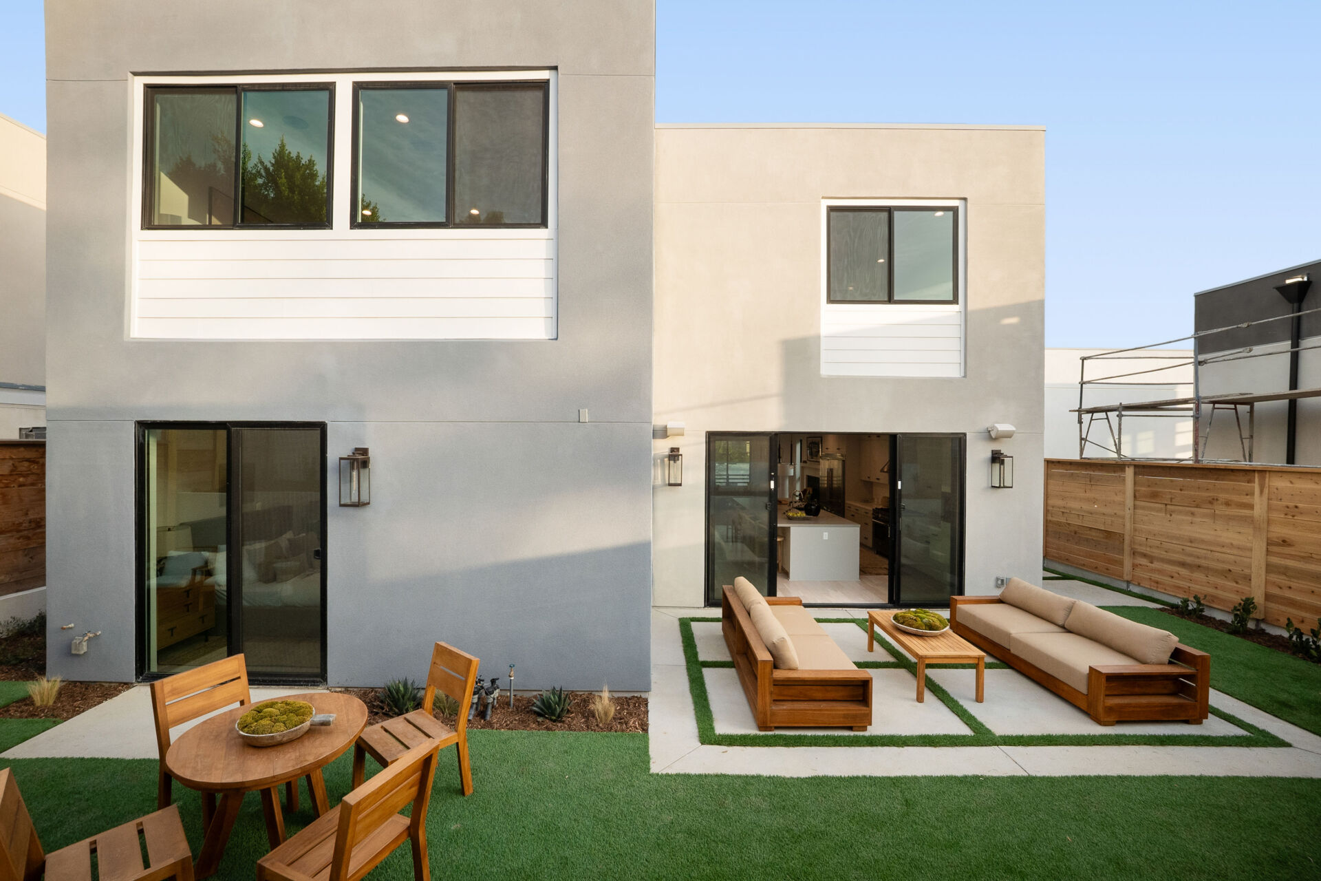 Soaring ceilings and a timeless architectural aesthetic create a sense of volume and light throughout. Expansive sliding glass doors open to a sun-kissed yard and alfresco dining terrace, offering seamless indoor-outdoor living.